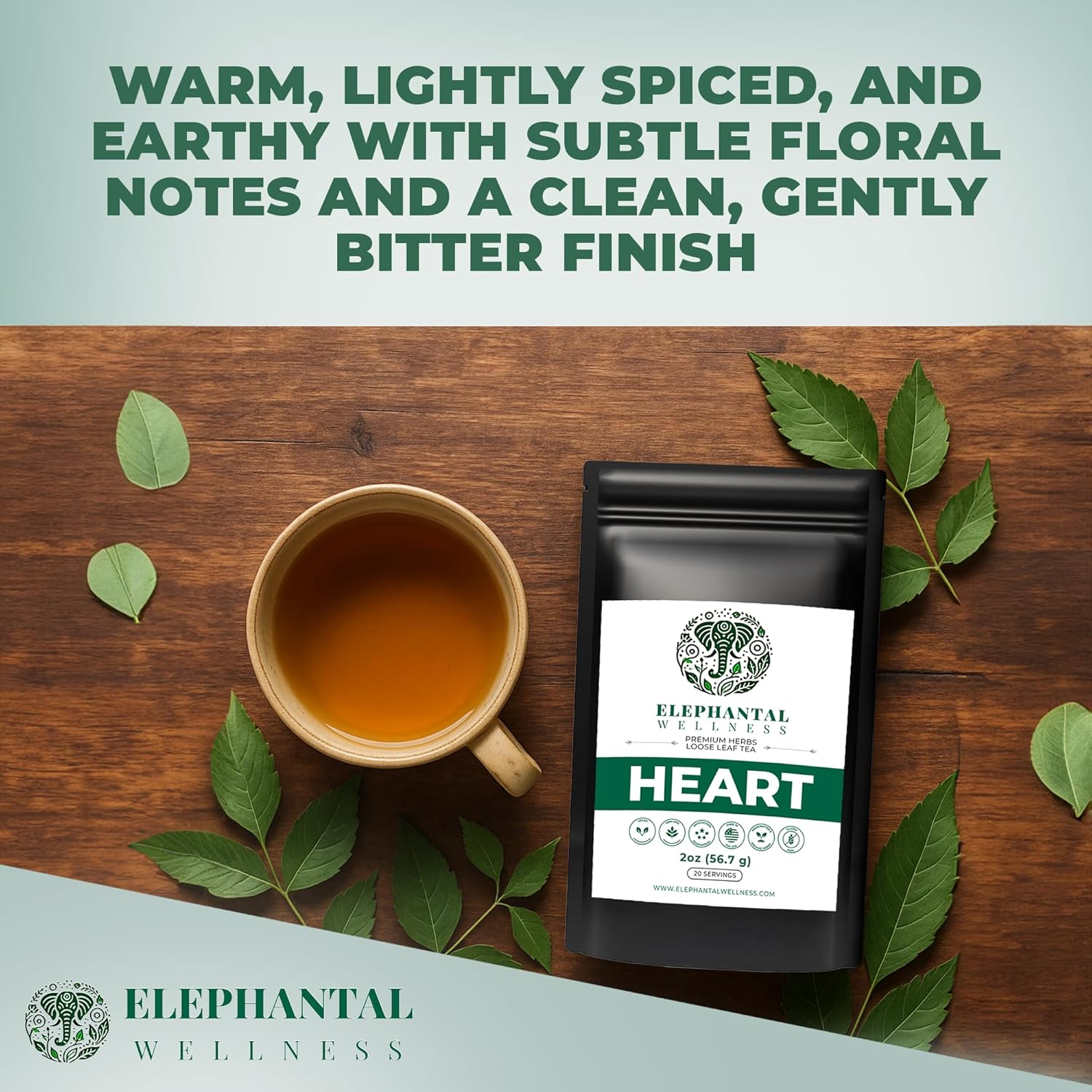 Elephantal Wellness Heart Herbal Tea is a thoughtfully crafted loose leaf tea designed to support the body’s natural cardiovascular and circulatory wellness. This balanced blend combines traditional heart-supporting botanicals including Hawthorn Leaf & Flower, Ceylon Cinnamon, Ginger Root, and Turmeric Root—herbs long valued in herbal traditions for promoting healthy circulation, vascular tone, and overall heart balance. Ginkgo Biloba Leaf and Rosemary Leaf are traditionally used to support blood flow and antioxidant protection, while Linden Leaf & Flower and Motherwort provide gentle calming support that complements heart and nervous system balance. Green Tea Leaf adds a light, natural source of caffeine along with beneficial plant compounds, offering gentle stimulation without the intensity of coffee. Smooth, warming, and lightly aromatic, this tea offers a refined flavor and a mindful daily ritual. Enjoy Elephantal Wellness Heart Herbal Tea as part of a balanced lifestyle focused on circulation, calm energy, and whole-body wellness.