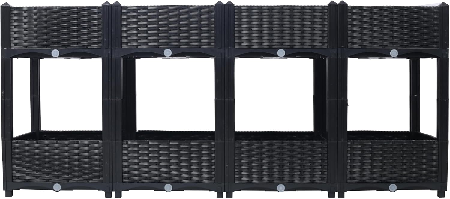 This Elevated Planter Garden Box is the perfect solution for those log to grow their own vegetables, flowers, and herbs. Crafted from durable and fade-proof polypropylene, these stunning planter boxes feature a stylish rattan pattern that will complement any decor. The self-draining system with a removable plug ensures healthy plant growth by preventing waterlogging. Enjoy the flexibility of customizing your gardening setup by adding or removing legs, arranging planters singly, or stacking them in a stair-step design to create a unique and eye-catching display. This raised garden bed provides numerous benefits, including keeping your plants elevated for better root aeration, protecting them from pesky weeds and animals, and offering an ergonomic height that makes gardening easier on your back. Ready to start growing your own food or simply beautify your outdoor space? This planter box is perfect for small spaces like balconies, patios, decks, or even indoors.