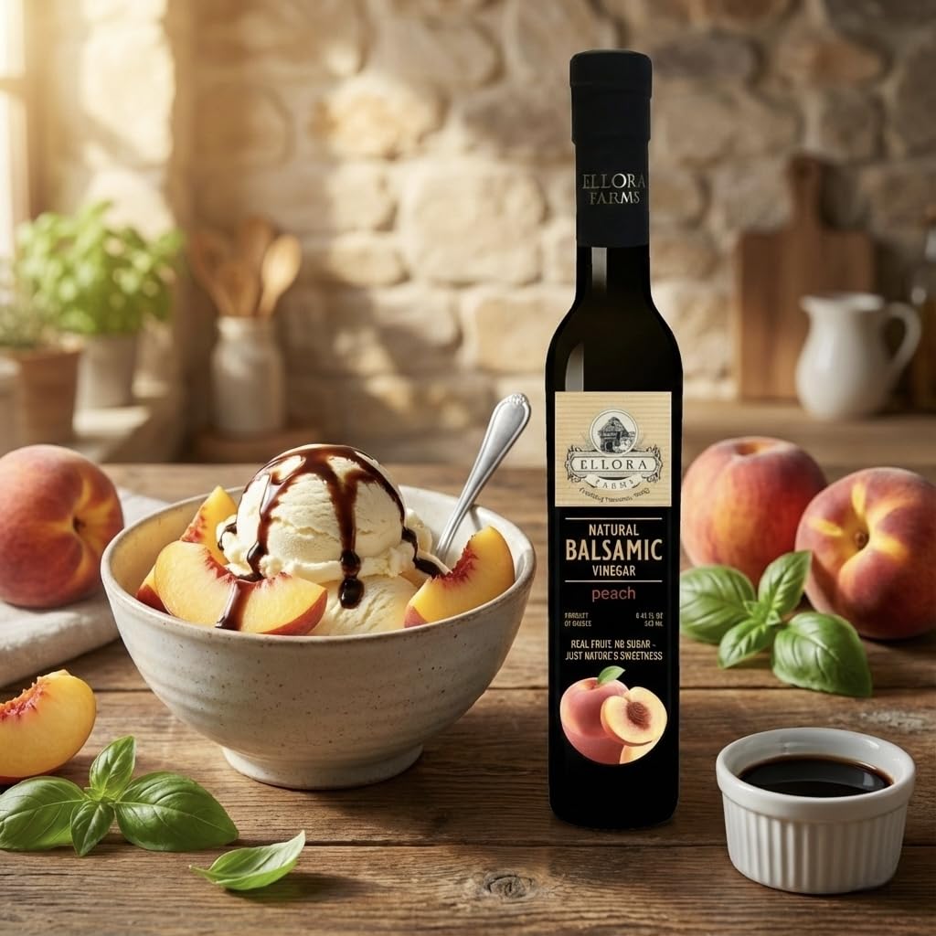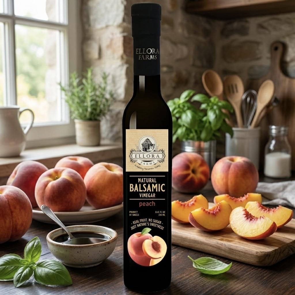 Combo Pack of Peach and Pomegranate Infused thick barrel aged Balsamic Vinegar Creme from Global Award Winning Brand Ellora Farms. All the Balsamics are crafted with years of research and are 100% Natural with no flavorings, no added sugars and no preservative. All the Balsamics contain actual fruit extracts or real fruit syrups and no flavorings or enhancers. Eat with Ellora Confidence for A Healthy Tomorrow, Today !