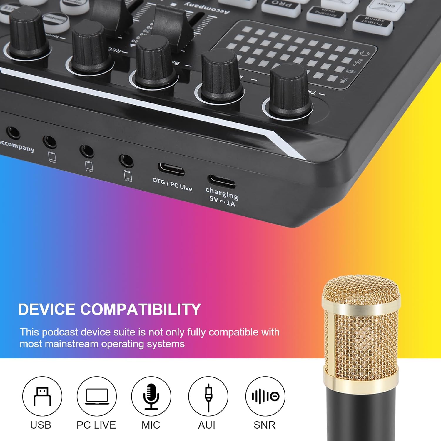 Lizusidtsy Colour:black Material:ABS Package Contents: 1 x sound card 1 x USB cable 2 x Live Line 1 x Headphones 1 x Microphone 1 x Tripod 1 x charging cable Only the above package content, other products are not included. Note: Light and different displays may cause the color of the item in the picture a little different from the real thing. The measurement allowed error is +/- 1-3cm.