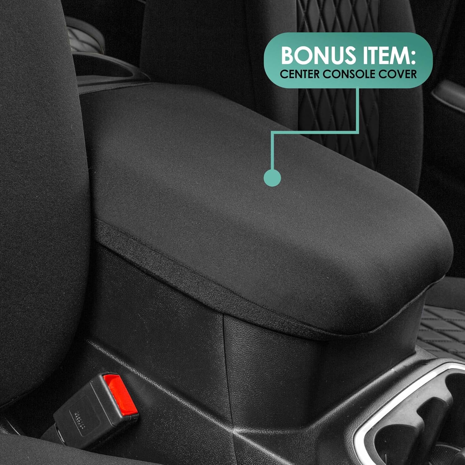| Included Components | 2 low-back front bucket seat covers, 2 separate headrest covers, console cover |