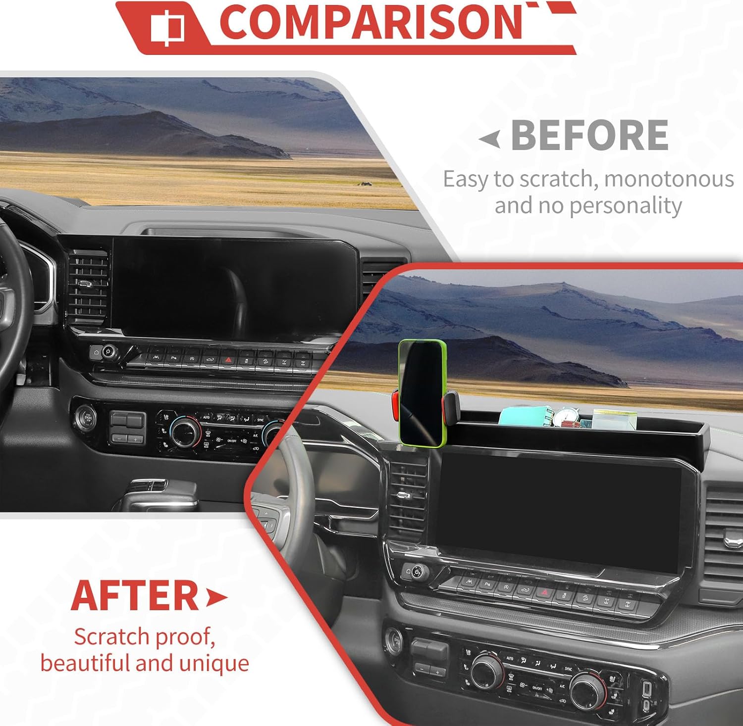 Fitment: - The Car Phone Holder Interior Accessories Fit for Chevrolet Silverado 2022 2023 2024 2025 up. The size is customized according to the original car, please check the model carefully and check the installation position of the car dashboard phone holder in the product detail picture before purchasing to avoid buying the wrong one. Features: -Universal design to accommodate most cellphone -You can easily and securely adjust the bottom foot to secure smartphones of all sizes. -The amayum dash phone mount with tray can easily insert your phone with one hand into the butter-smooth, spring-loaded phone holder. -Ultra-durable premium construction, water resistant, easy clean design. -Amayum dashboard cell phone automobile cradle is fully adjustable to meet your preferences - an adjustable bottom foot to fit all phones, a release button behind for more convenient operation, and a 360° rotation ball joint to turn from. Installation Guide: The product installation can be viewed in the attached video. Package Include: - Amayum Car Black Dashboard Cellphone Holder With Tray*1