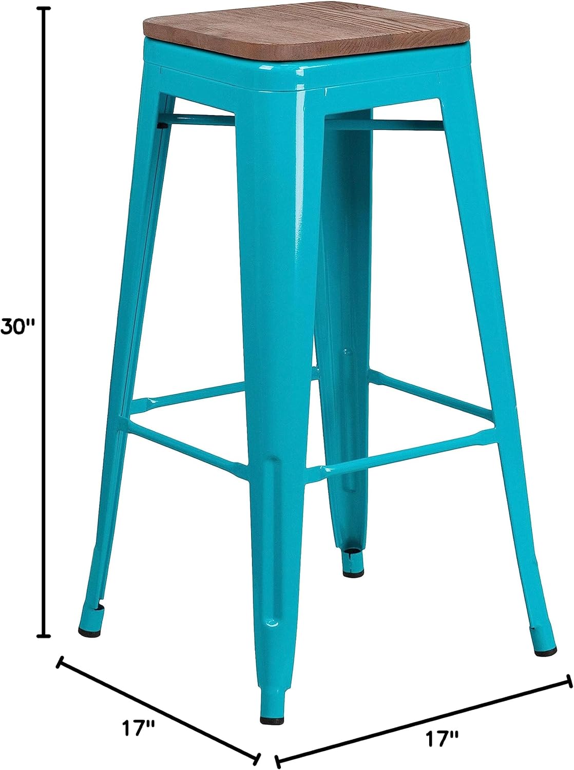 Save on space with this Backless Metal Bar Stool with wood seat. The clean lines and simple design of this square, industrial style stool will look great in your kitchen or inside your bar/restaurant. Designed to stack, this stool is an ideal choice in the restaurant industry. A cross brace underneath the seat adds extra stability and features plastic caps that prevent the finish from scratching when stacked. The lower support brace doubles as a footrest, and floor glides protect your floor by sliding smoothly when moving it. Designed for both commercial and residential use, this bar height stool will provide refreshing rustic feel with its metal and wood features.