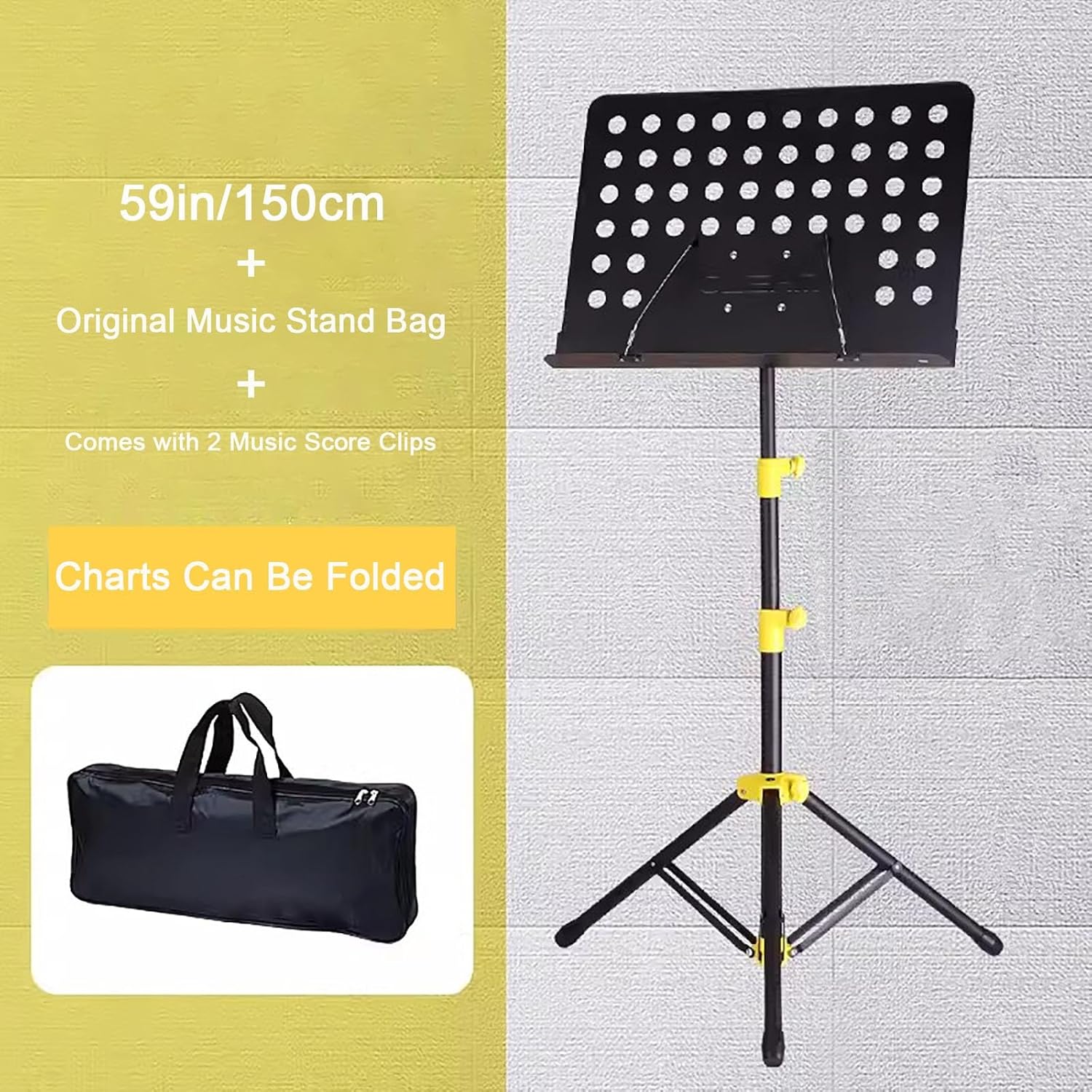 The height can be adjusted freely from 31.4in/80cm to 59in/150cm.Durable thick metals and unique 3-layer anti-rust coating technology.Tray tilts 180 degrees for maximum flexibility.SpecificationsColor: Black、YellowNet Weight: 2.7KG.Material: Steel and Engineering PlasticsAdjustable Angle: 180°Come with clamp-on rack tray holder to put accessories such as smartphone, pencil etc.Quick assembly and easy storage with a carrying bag, suitable for travel, school, bands and home.Warms Tips:1.Manual measurement, there are slight errors; please refer to the actual items received, so as not to interfere with the imagination.2. If you have any questions, please contact us, we will reply to you within 24 hours.