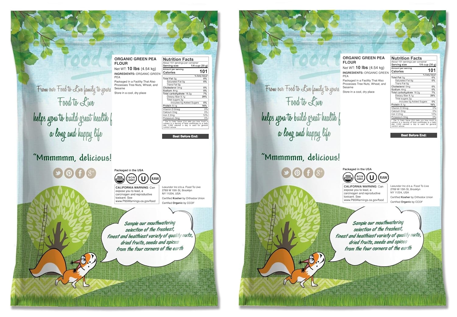So, what is Pea Flour? Let us introduce Food to Live’s Vegan, 100% Raw, Non-GMO, and Organic Peas Flour produced by grinding dried Organic Green Peas into a fine texture. This flour has a light-green color and a neutral somewhat nutty taste which works wonders in a variety of recipes. How to use Organic Green Pea Flour? Organic Pea Flour aka Organic Pea Powder is a super versatile ingredient that will come in handy at any kitchen. Green Peas Flour serves as a wonderful substitute for Wheat, All-purpose, Rye, and Barley flours. Use it for your baked goodies: muffins, cakes, cookies, crackers, breadsticks and flatbreads; as a thickener for soups, stews, gravies, and sauces; or as a crunchy coating for your fried veggies, fish, and meat. Apart from that, Green Pea Flour Organic can be used for cooking pancakes, home-made pasta, pizza crusts and tortillas. At Food to Live, you may pay less per unit by buying Organic Pea Flour Bulk bag. Considering its pretty long shelf life, this Flour will be a great pantry staple. Organic Pea Flour Nutritional Profile Powdered Organic Peas are highly nutritious and will be an amazing part of a balanced diet. Green peas flour is an ideal choice for those looking to boost their protein intake, as it contains up to three times more protein than traditional wheat flour (that’s why it is sometimes sold as Pea Protein Powder). In addition, this flour is rich in dietary fiber but relatively low in carbs which makes it Keto-friendly. Organic Green Pea Flour is also a great source of various Vitamins and essential minerals including Vitamins C, A, Iron, Manganese, Folate, Thiamine, and Phosphorus. Storage Tips To ensure your Organic Green Peas Flour stays fresh, keep it in an air-tight container in a cool dry place away from direct sunlight. If you buy bulk Organic Pea Protein Powder to store it long-term, we advise putting it in a fridge.