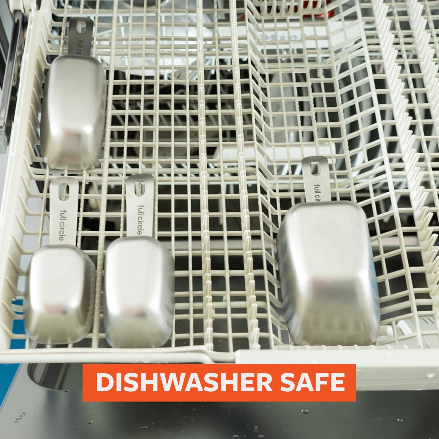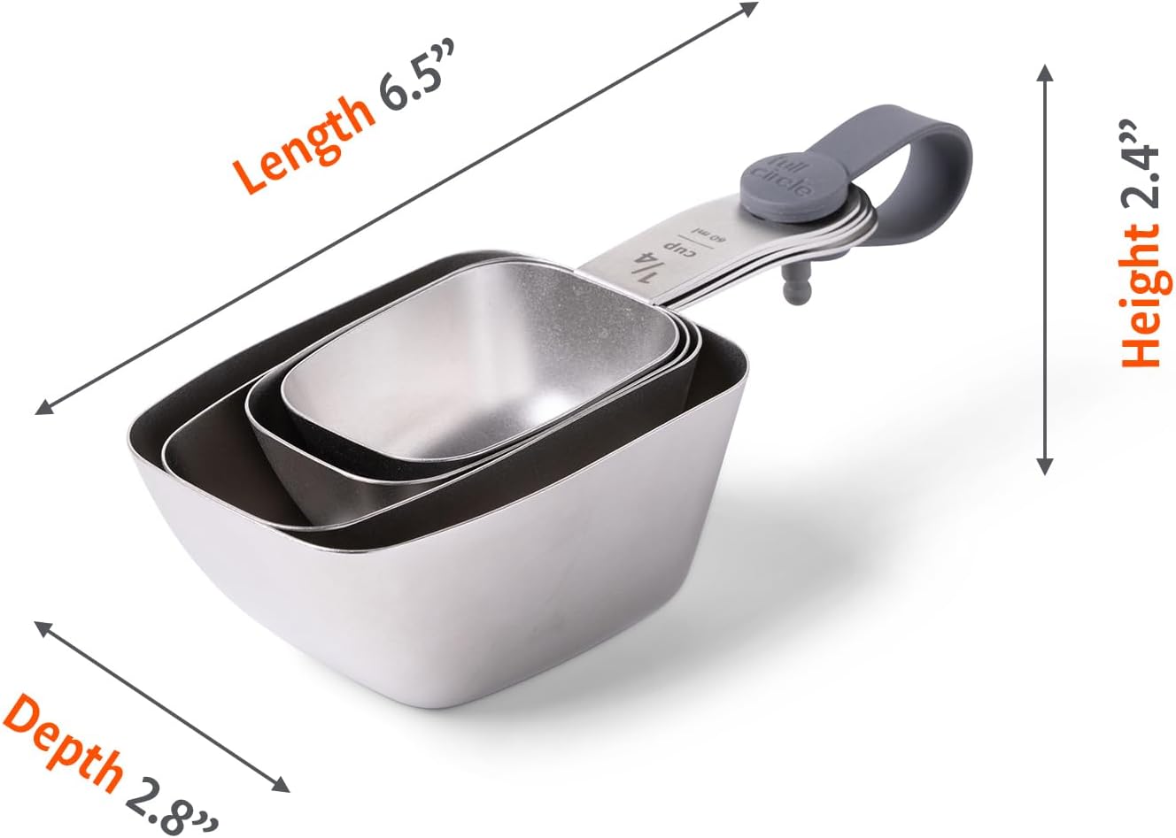 Round measuring cups can’t measure up! These stainless-steel measuring cups let you scoop while measuring – the scoop shaped cups reach deep into the corners and edges of containers, unlike traditional round measuring cups. Made from durable stainless steel with laser-etched measurements that won’t fade, this set includes ¼, ⅓, ½, and 1 cup scoops. The space-saving nesting design and flexible silicone tether make these measuring cups as practical as they are precise. Dishwasher safe and built to last without retaining odors or stains.