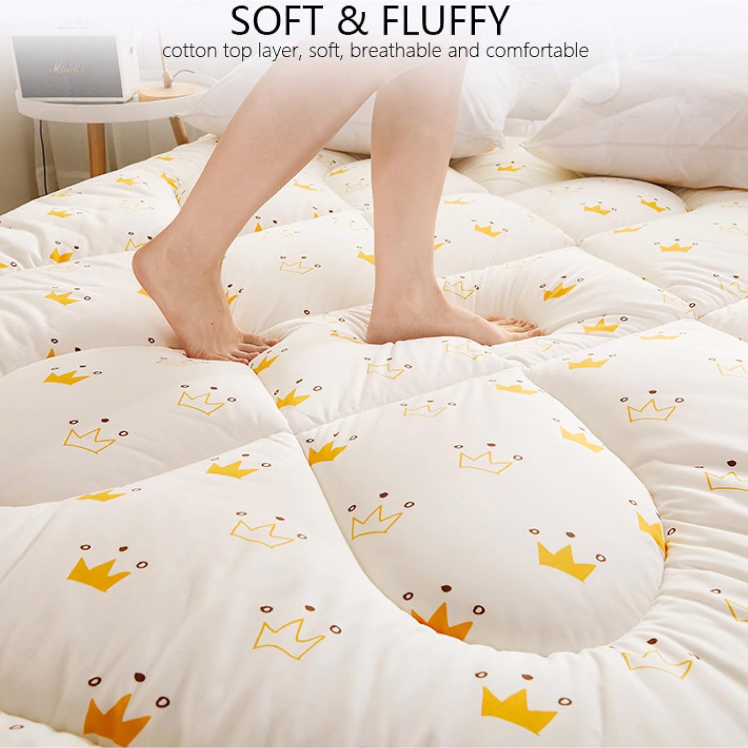 Our comfortable mattress topper provides you soft cushioned support for extra comfort and breath-ability for a restful sleep.Specifications:Filler: Natural CottonFabric: CottonBREATHABLE & SKIN-FRIENDLYMade of 100% cotton fabric, offering cozy and breathable sleeping environment. This skin-friendly fabric can reduce unnecessary noise and movement and it doesn't bother your sleep at night.QUILTED DESIGNConstructed with classicl quilted and stream pattern style to prevent filler shifting. Compared to the normal quilting seam, this one is more supportive and soft. You can sleep peacefully at night without worrying about the movement of the filler.NON-SLIPWith the four elastic straps, the mattress topper can be fixed tightly on the mattress.NOTEFor your convenience, your tatami mattress has been folded and compressed. After opening, it may take up to 2~3 days to return to the expected size.This mattress pad is a perfect choice if you're considering a comfortable, soft, breathable and high quality mattress pad. If you have any questions, please feel free to contact us and we will provide you with the best solution.