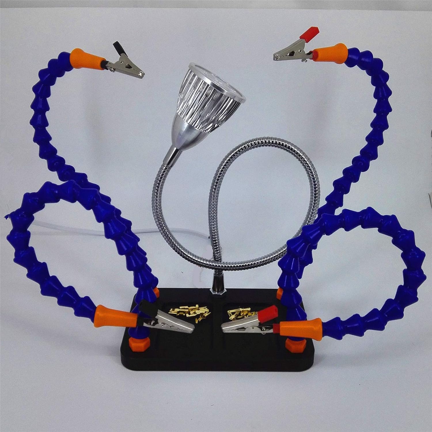 Are you frustrated with traditional third hands? Do you want a more adaptable tool? The Third Hand is the highest quality helping hand on the market! The Third Hand quickens soldering, electronics, and DIY projects allowing you to finish your work faster than ever before! Our Third Hand makes positioning a breeze with four 12” flexible arms. Hold large and irregular components easily with large alligator clips attached with protective clip covers to prevent marring. The precision machined base is anodized to last a lifetime. Dual machined pockets in the base hold small components and hardware without needing separate containers. The Third Hand comes fully assembled out of the box so you can spend more time on your latest project. (4) Flexible 12” Arm w/ Large Alligator Clip Securely attached using thread locker Precision Cut and Anodized Base (2) Pockets to hold loose component