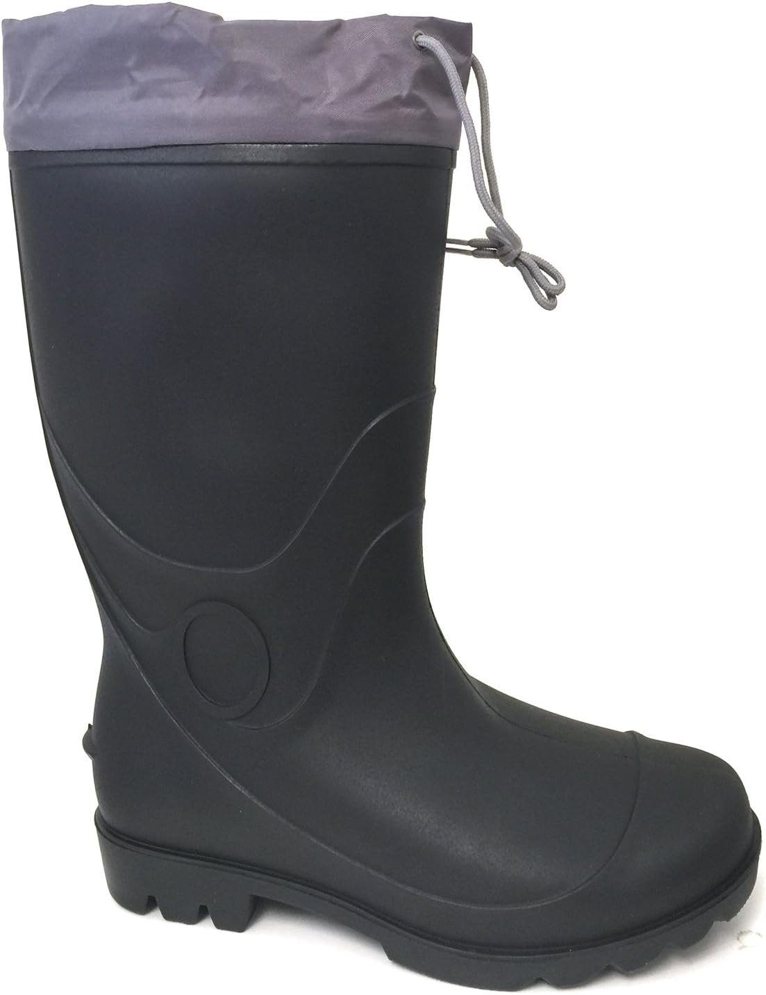 These black men's rain boots are made of quality durable EVA, PVC materials to keep your feet dry and warm. Feature round toe, drawstring closure with nylon collar. These rain boots have a 1 inch heel and 12 inch shaft height. Seamless construction for 100% waterproof protection. Good for outdoor activities or work in rainy weather and winter