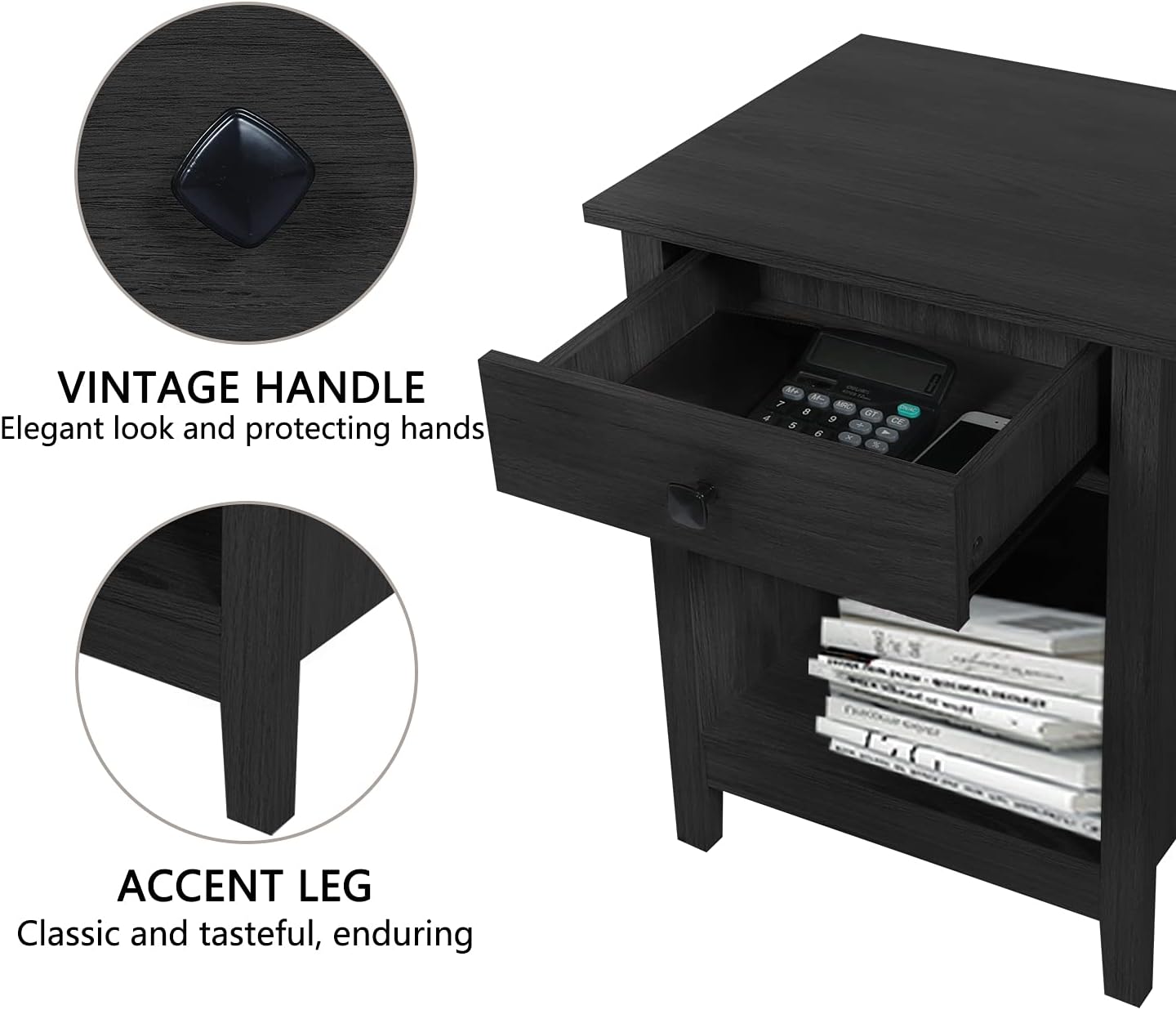 GBU Nightstand and End Table Increase a art to your room and free your life from messy and disorder. 1-Drawer GBU nightstand is both vintage and functional. Sturdy wood material and smooth wood grain sticker is perfect for keeping the cups, glasses and magazines at your hands. You can also get a private bookshelf when you fill the cubby below with books Creating a comfortable environment for yourselves and your family. We are committed to providing and choosing beautiful and practical furniture for you Features and Benefits ?? Both classic retro look and practical make room more charming and efficient ?? Full wood material make this table more sturdy and stable ?? Perfect size for putting lamps, glasses, photo frames and else ?? Waterproof sticker are odorless and anti-rust, more durable and safe ?? No worry about purchase, you will get refund if there is any problem with this order Material and Size Material: Quality P2 MDF + Wood Grain Waterproof Sticker + Metal Handle Product Dimensions: 18.74inch(L) x 15.66inch(W) x 23.93inch(H) Drawer Size: 13.38inch(L) x 12.20inch(W) x 3.14inch(H) Weight Capacity of Table: 120LBS Weight Capacity of Drawer: 15LBS Package Include 2 x Nightstand 1 x Instruction 1 x Screw and toolkit