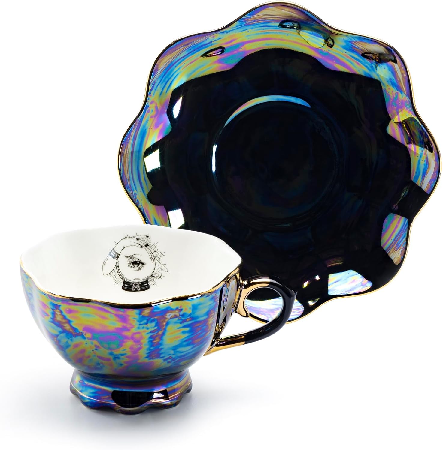 Please note that each luster tea cup is carefully handcrafted, resulting in distinct and artistic variations in appearance, making each cup a one-of-a-kind piece.Each set includes one cup with one saucer SpecificationsCup Dimension:3.25” Height x 5” Width x 4" DepthCapacity - 7.5oz Saucer Diameter:6.25"MaterialPorcelain, Gold trim, LusterCare AdviceHand wash recommendedNot microwave safe due to gold trim