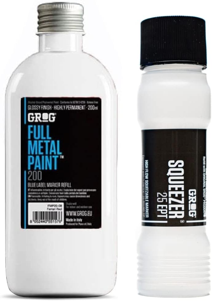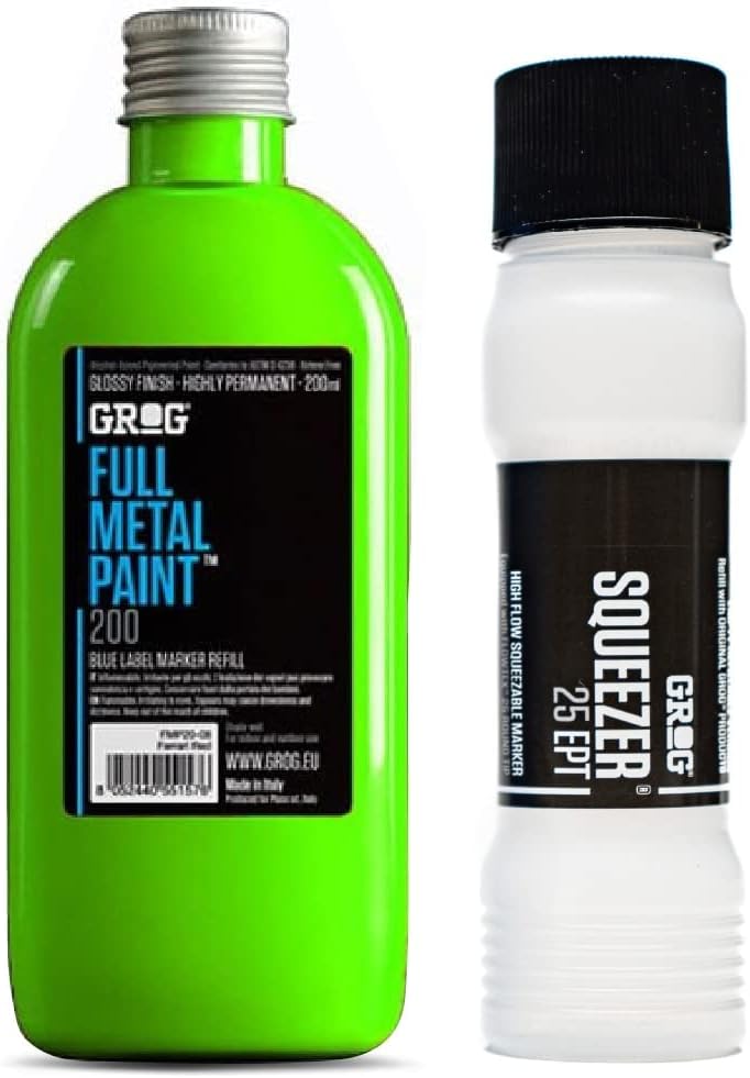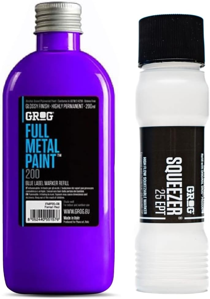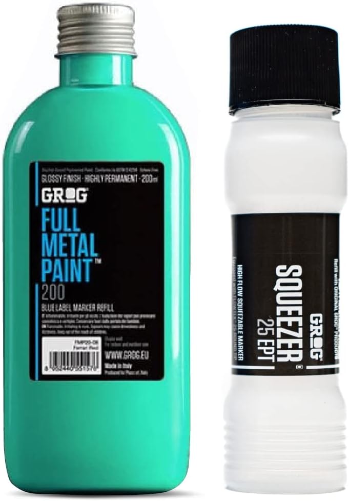 Grog's Full Metal Enamel Paint is a super-bright, permanent paint mixture that can be used in basically any marker or mop. The quality of the new formula guarantees maximum coverage on any surface. It has a gloss finish and it’s resistant to weathering. 200ml. The grog squeezer 25 marker has a 25mm wide nib that can withstand use on any surface. Due to its soft plastic body, this marker can be squeezed easily allowing perfect control of ink release. The Grog Squeezer 25 can be filled with 100ml of any ink or paint!
