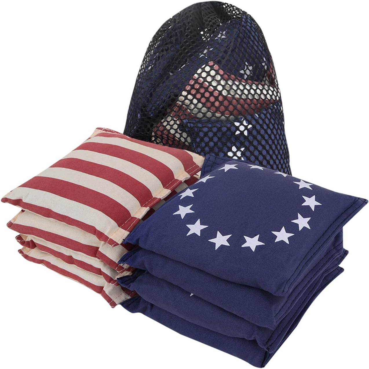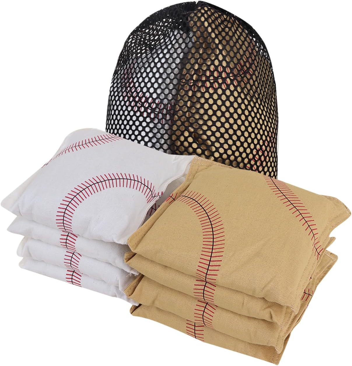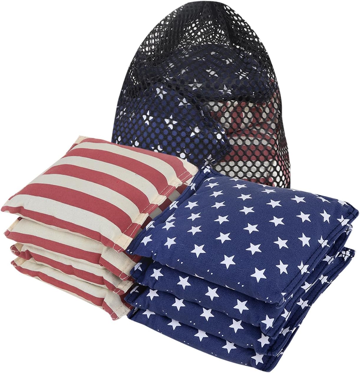 The premium cornhole bags made from durable duck cloth fabric with double-stitched. Perfect to be used on any playing surface (grass, gravel, concrete). Provide tear resistance excellent durability, and abrasion resistance. The all-weather cornhole bags with built-in waterproof nylon inside bag, and filled withresin pellets so they can handle all weather even rain! Set comes with 8 official regulation size cornhole bags. Each bags measure 6"x6", and 15-16 ounces in weight, the cornhole bag as Prescribed by ACA Regulations. Mesh drawstring storage bag included for easy transporting and and storage. When you play game on beach or lawn, the mesh bag will leave sand and weeds behind without bringing home.