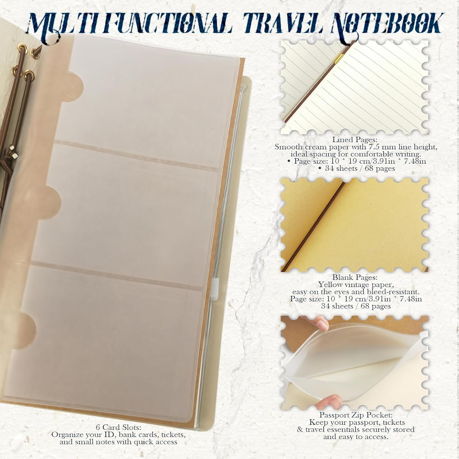 Travel with your memories safely organized and beautifully preserved. This handmade refillable travel notebook combines journals + passport wallet + card organizer into one compact A6 travel companion. The soft vegan leather cover feels luxurious without using animal materials, making it a conscious and stylish choice. ✅ Front frosted pocket fits passports, tickets & boarding passes ✅ Rear frosted card sleeves hold ID cards, bank cards & travel documents ✅ Refillable notebook insert for daily writing, planning & sketching ✅ Zipper pocket storage for receipts, stamps & travel mementos ✅ Gift set includes pen, clip, velvet bag & charm Perfect for: Travelers & digital nomads Students & productivity lovers Writers, sketchers & journal fans Gift-givers seeking a meaningful keepsake Wherever you go, capture your thoughts, keep your essentials secure and create a journal you'll treasure for years.