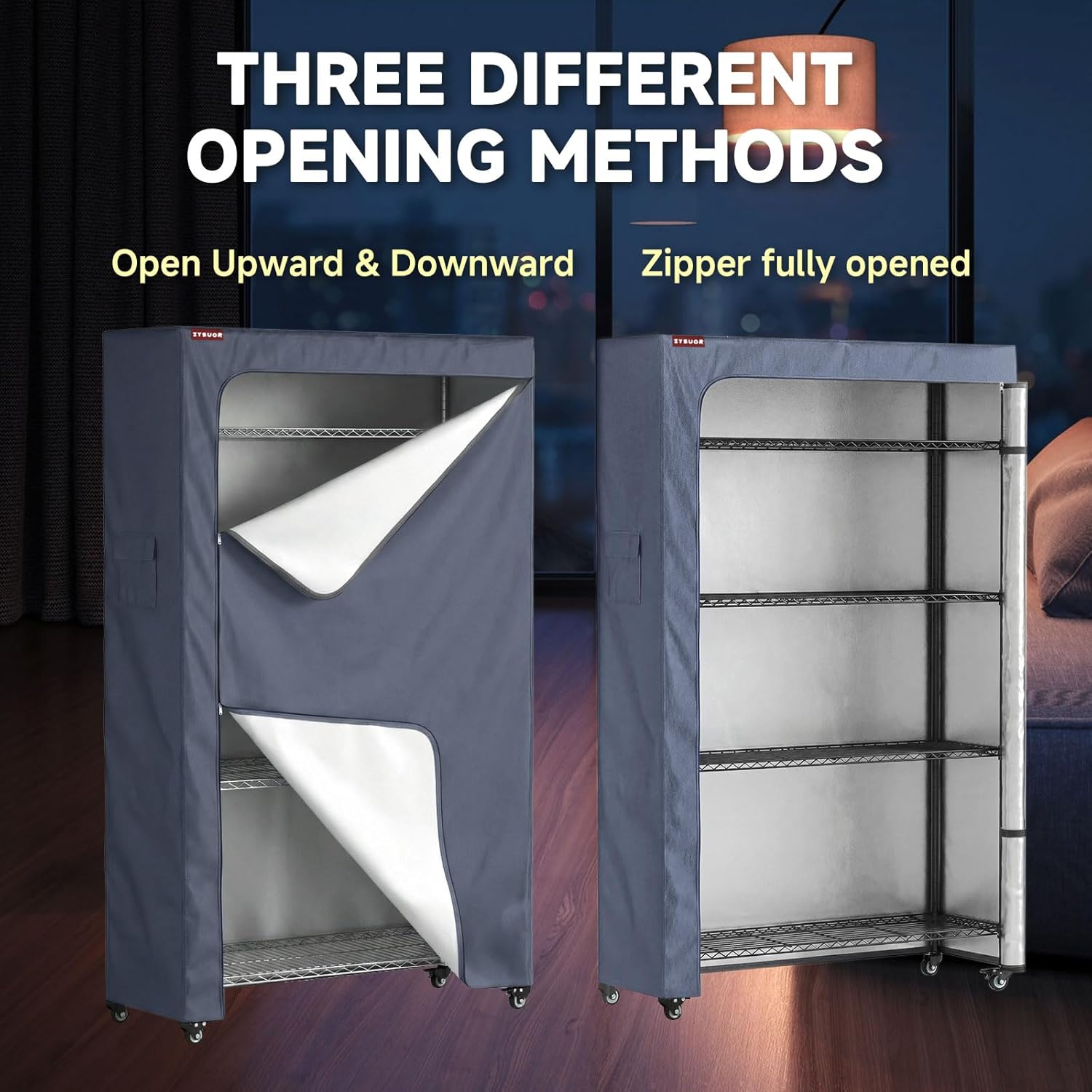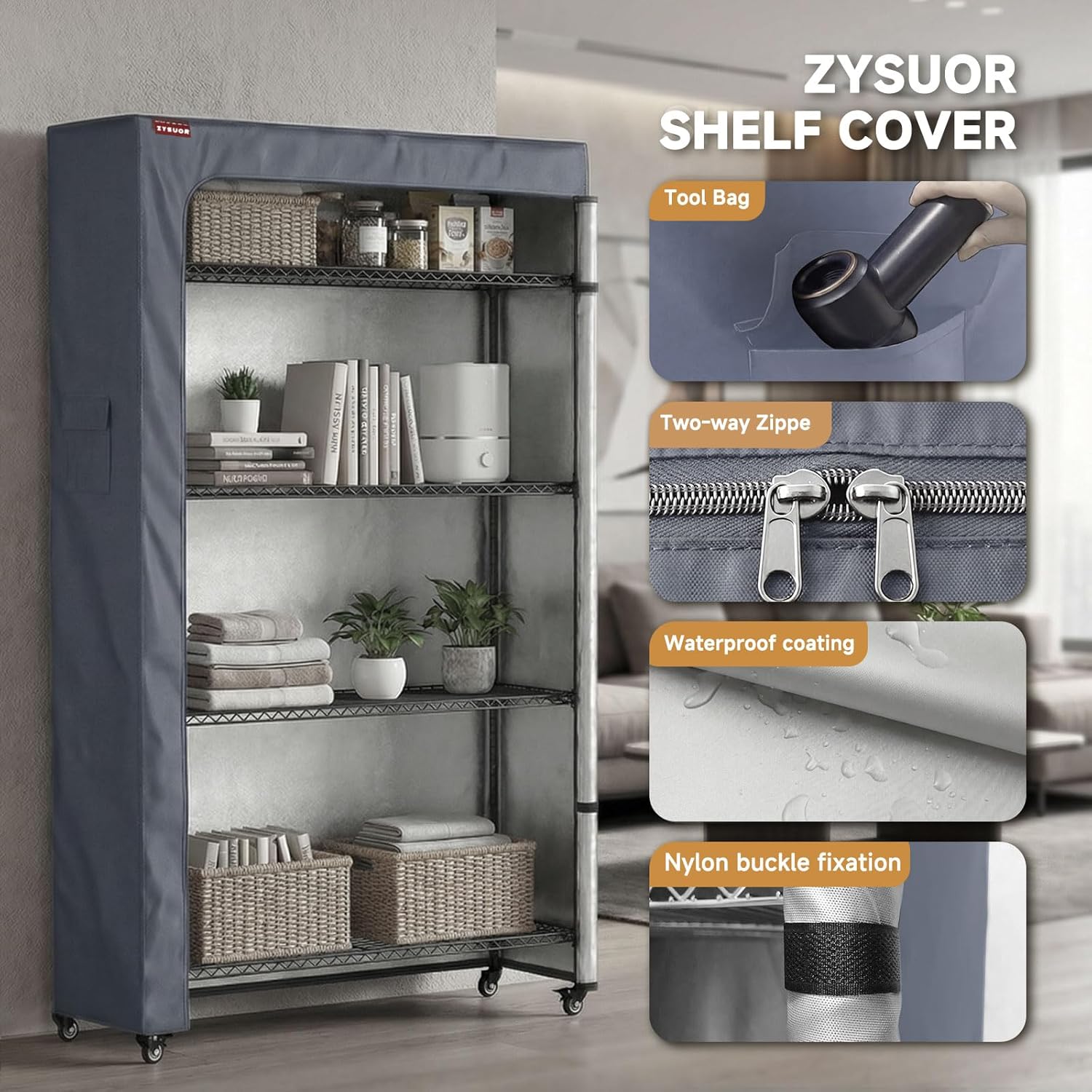Upgrade storage with ZYSUOR 600D Oxford Rack Cover. Waterproof & dustproof, it features a unique 3-way opening for easy access. Includes a side tool pocket and internal Velcro for a snug fit. Perfect for garage, kitchen, and pantry racks. Durable, all-season protectio