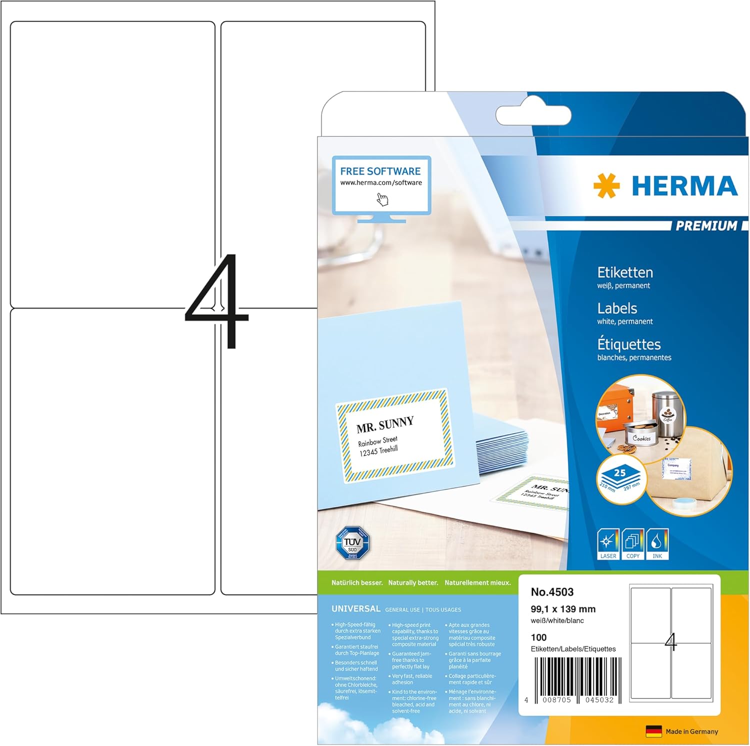 Self-adhesive labels on A4 sheets, permanent adhesive. Perfect for all laser and inkjet printers, copiers, colour laser printers and colour copiers. Guaranteed jam free and high-speed capable thanks to extra strong special composite, top flatness and all-round safety edge. Hassle-free printer run for laser printers and inkjet printers tested and confirmed by TÜV SÜD. High whiteness and even surface for best printing results in black and colour. Noticeably thicker: extra strong labels, easy to stick. Especially quick and safe adhesion, even on cool and damp surfaces. Environmentally friendly and sustainable: chlorine-free bleached, FSC® Mix Credit certified, solvent-free adhesive. Labels are 100% recyclable with recycled paper packaging. Free software solutions: www.herma.de/software.