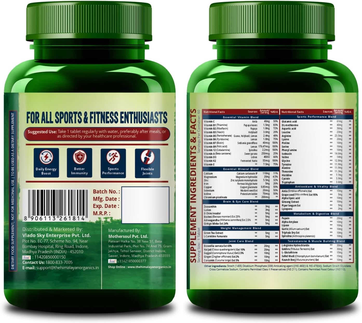 BOOSTS ENERGY & METABOLISM: Himalayan Organics Multivitamins for Sports contain 60+ micronutrients & 14 Performance Blends that play an important role in energy metabolism as these are required as functional parts of enzymes involved in energy release and storage. 60+ NUTRIENTS & NATURAL HERBS: Enriched with the essential vitamins and minerals which help in strength training and support increased energy and focus. It also contains tribulus terrestris, ginseng extract, ginkgo biloba, grape seed, pine bark etc