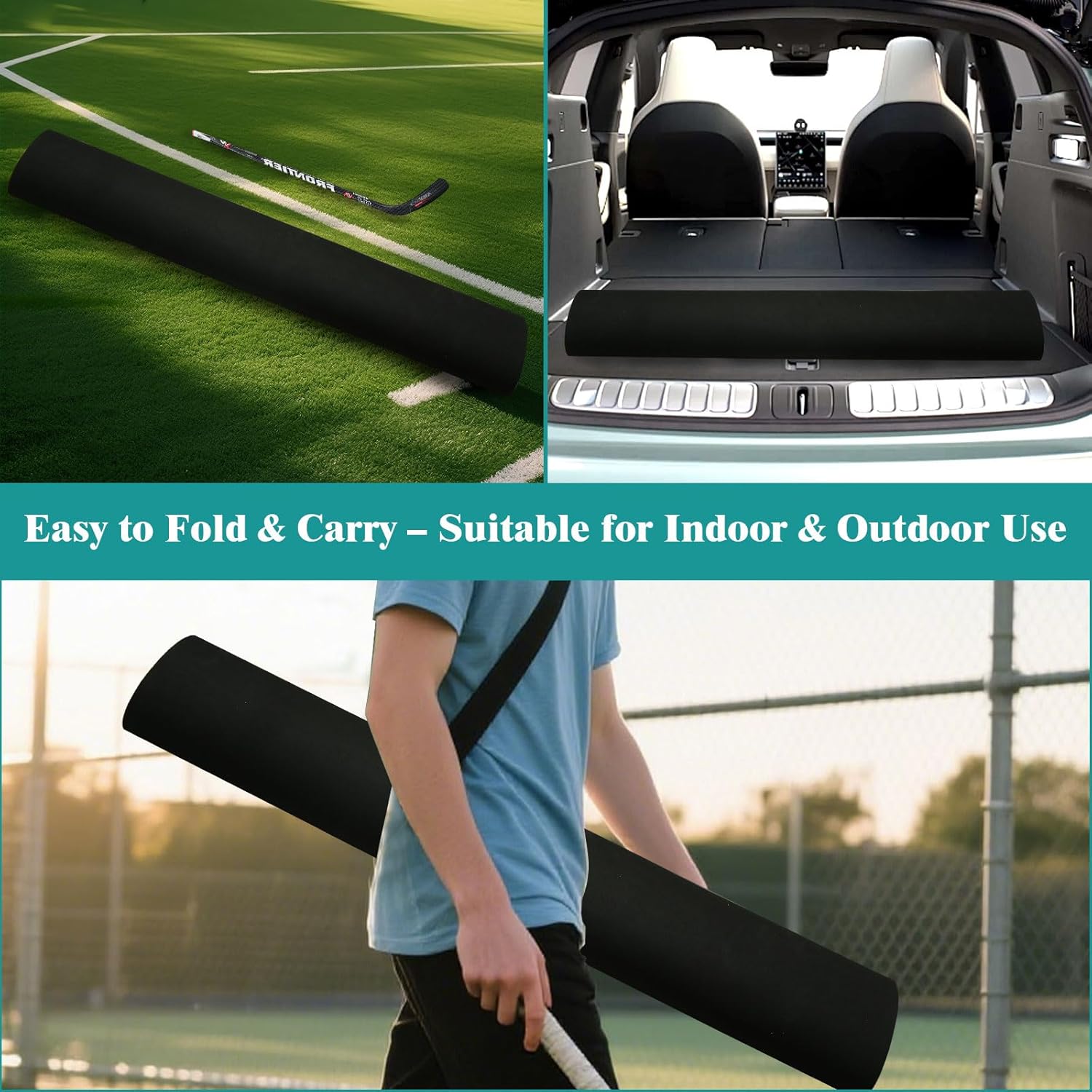 Hockey training mat helps players improve stickhandling, shooting, and overall skills. Made of high-quality rubber with anti-slip and noise-reducing features, suitable for indoor and outdoor use. Pre-printed lines guide drills to enhance control, coordination, and speed. Works well on wood, tile, turf, and concrete for versatile training. Lightweight and flexible, easy to roll up for storage and portability. Suitable for all skill levels, making it an ideal training aid and gift.