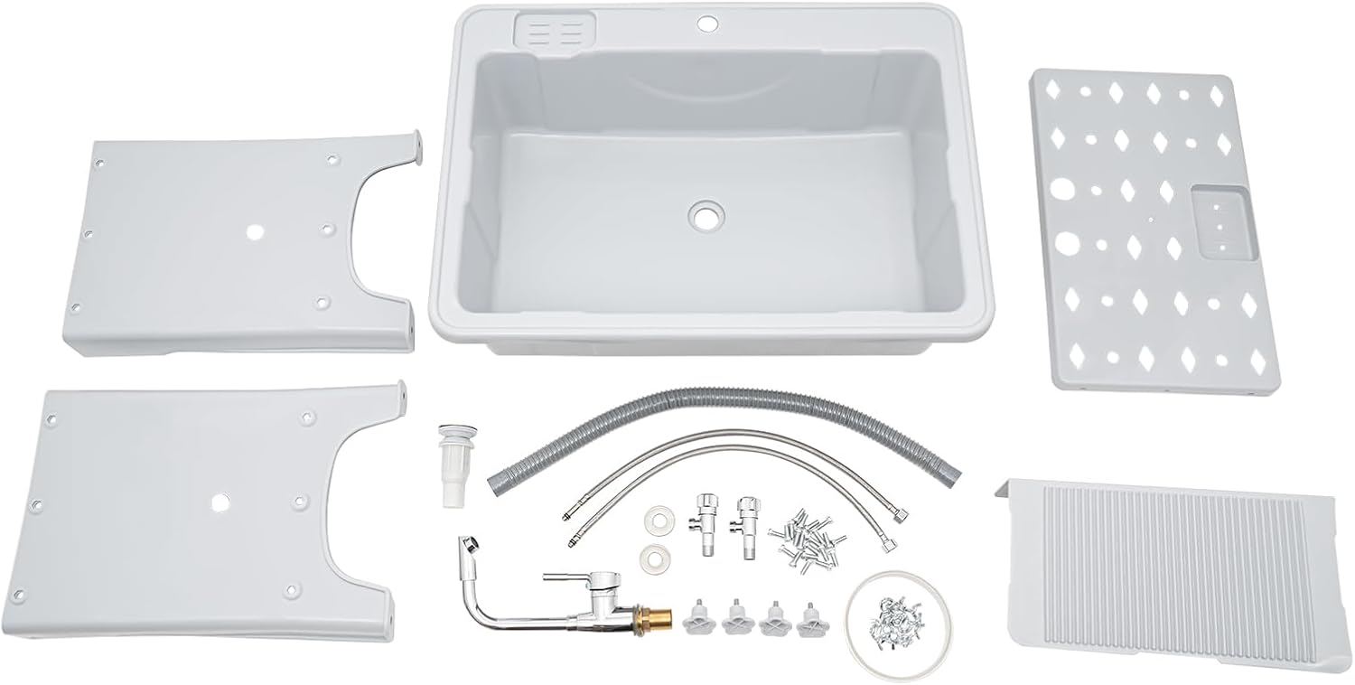 | Included Components | Package Included 1* Freestanding Plastic Laundry Sink 1* Washboard 1* Hot and Cold Faucet 2* Water Pipes 2* Valves 1* Drain Pipe 4* Feet 1* English Manual All Accessories for Installation |