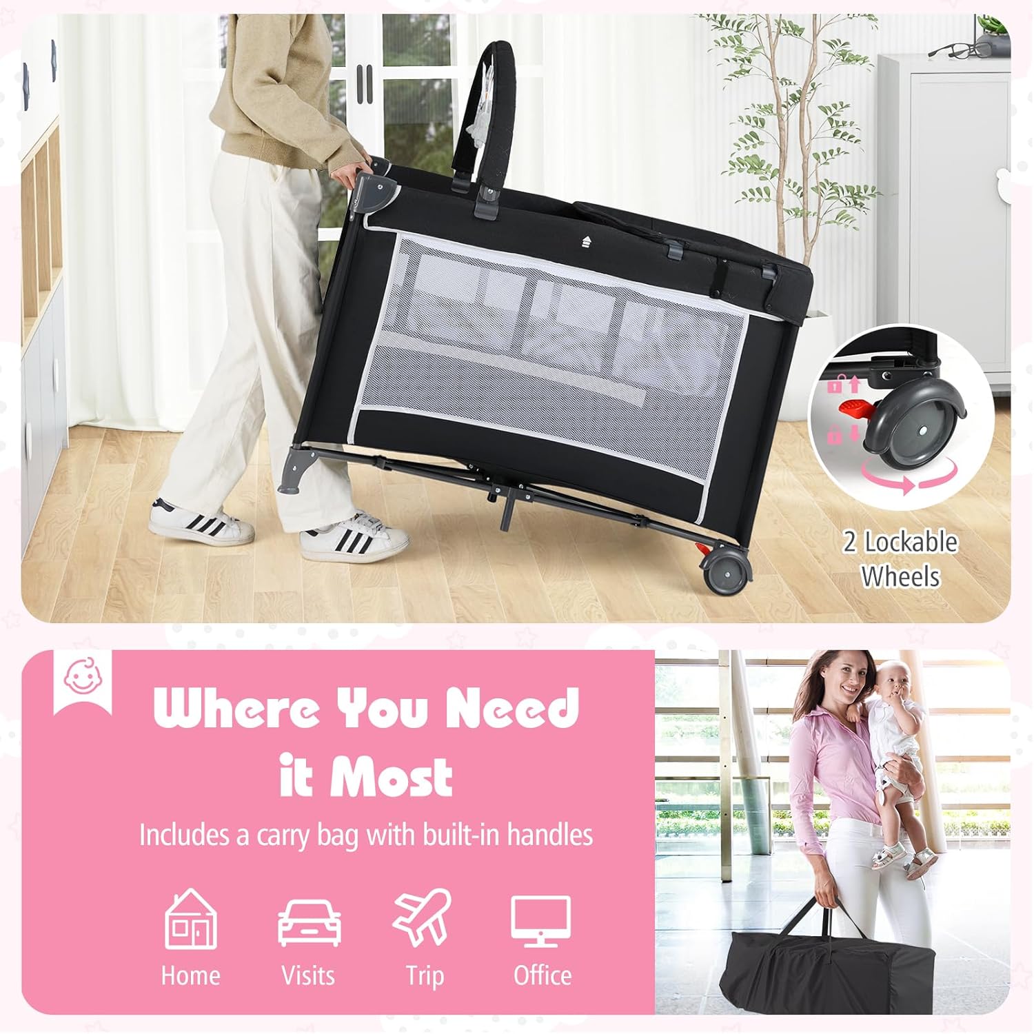 Description: Give yourself the gift of worry-free parenting! Our versatile 4-in-1 pack and play offers a safe space for baby to sleep, play, and get changed - all in one portable combo. Engineered for stability, its 7-point support system and lockable wheels keep baby secure at home or on the go. Breathable mesh walls and rounded corners ensure safety, while thoughtful details like the waterproof changing pad, storage pocket and playful toy bar simplify your routine. Cherish every precious moment with your little one, wherever life take you! Features: 4-in-1 baby crib with a soft, foldable mat keeps baby safe and snug Lower playpen offers a safe place for baby to explore and have fun Includes a waterproof changing table for less cleaning work Easy diaper changing with a reasonable table height Serves also as a bedside bed for co-sleeping Moves where you need it most with 2 lockable wheels Sets up and folds down in minutes for ease of use Includes a carry bag with built-in handles for taking it on trips Breathable mesh walls allow air flow while keeping baby secure 7-point support system ensures rock-solid stability Rounded corners and safety harness for worry-free caring Detachable toy bar with 3 plush toys keeps baby entertained Side storage pocket holds diapers, wipes and essentials ASTM and CPSIA compliant for parents’ peace of mind Specifications: Color: Black/Pink Material: Oxford Fabric, PP, Metal, Mesh Cloth Overall Dimension: 40.5" x 28" x 28"/103 cm x 71 cm x 71 cm (L x W x H) Changing Table Dimension: 27.5" x 17.5"/70 cm x 44 cm Carry Bag Dimension: 31.5" x 8" x 9"/80 cm x 20 cm x 23 cm (L x W x H) Weight Capacity of Changing Table: 19.8 lbs/9 kg Weight Capacity of Bassinet: 19.8 lbs/9 kg Weight Capacity of Playpen: 19.8 lbs/9 kg Suitable Age: 0-3 years old Net Weight: 25.5 lbs/11.5 kg Package Includes: 1 x Pack and Play 1 x Carry Bag 1 x User Guide