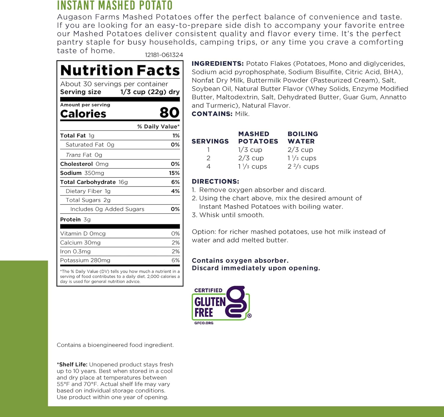 Augason Farms Instant Mashed Potatoes are the prefect balance of convenience and taste. Once you taste the buttery flavor and seasonings, you'll want to keep this in your kitchen pantry and your long term food storage. Easy to prepare side dish to accompany your favorite entree, our mashed potatoes deliver consistent taste and flavor every time. It's the perfect pantry staple for busy households, camping trips, or any time you crave a comforting taste of home. Total Servings: 30 Total Calories: 2,400 Calories per Serving: 80 Container Size: #10 can with lid Net Weight: 23 oz (1 lb 7 oz) 652 g Shelf Life: Up to 10 years* *Shelf Life: Unopened product stays fresh up to 10 years. Best when stored in a cool and dry place at temperatures between 55°F and 70°F. Actual shelf life may vary based on individual storage conditions. Family owned and operated since 1972, Augason Farms products are guaranteed for their great taste and superior quality. Include Augason Farms in your pantry for everyday use or in your emergency food supply for the unexpected.