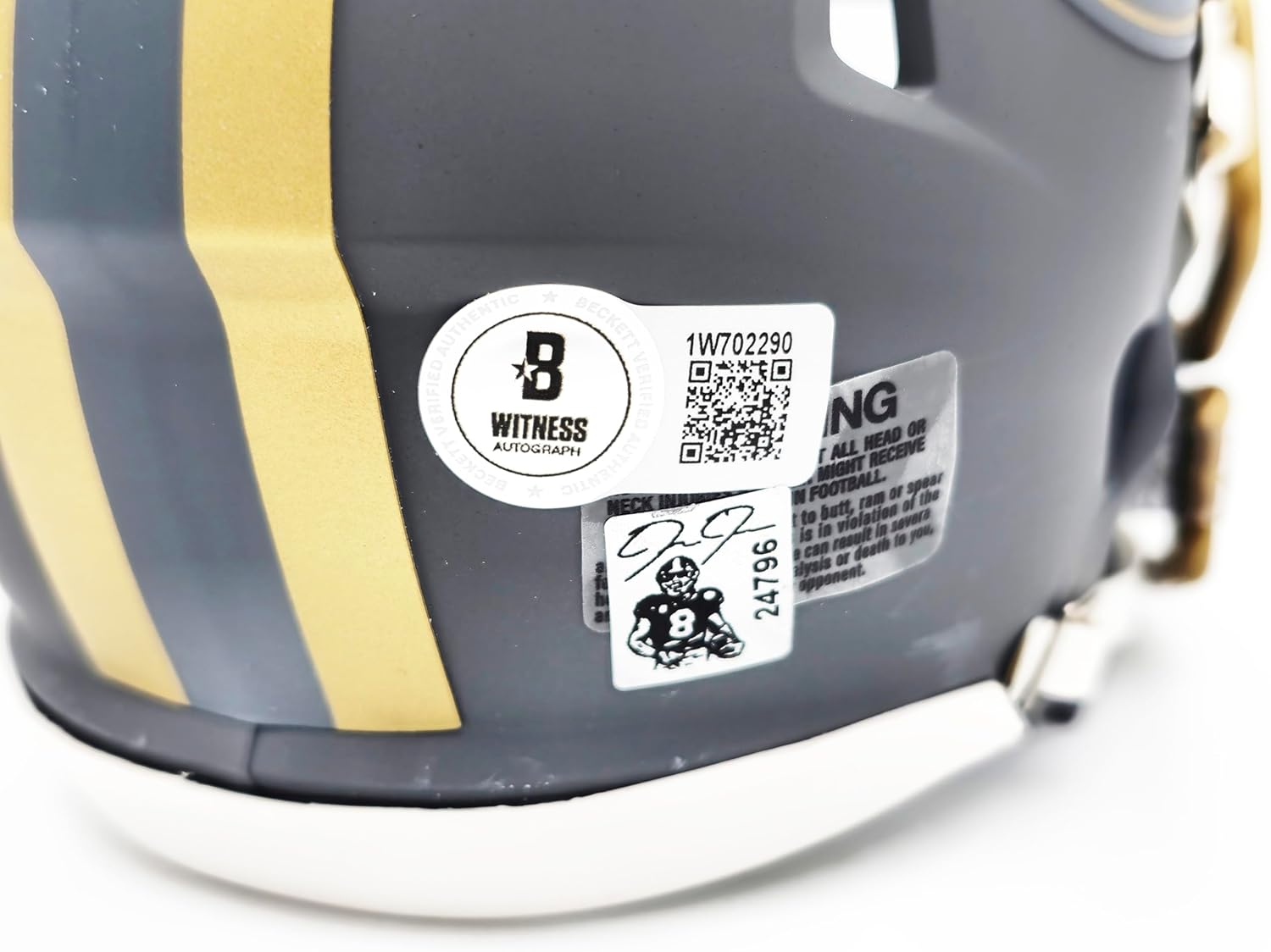 This is a Slate Gray Speed Mini Helmet that has been hand signed by Josh Jacobs. This item has been witnessed and certified authentic by Beckett Authentication (BAS) and comes with their tamper-proof witness sticker.