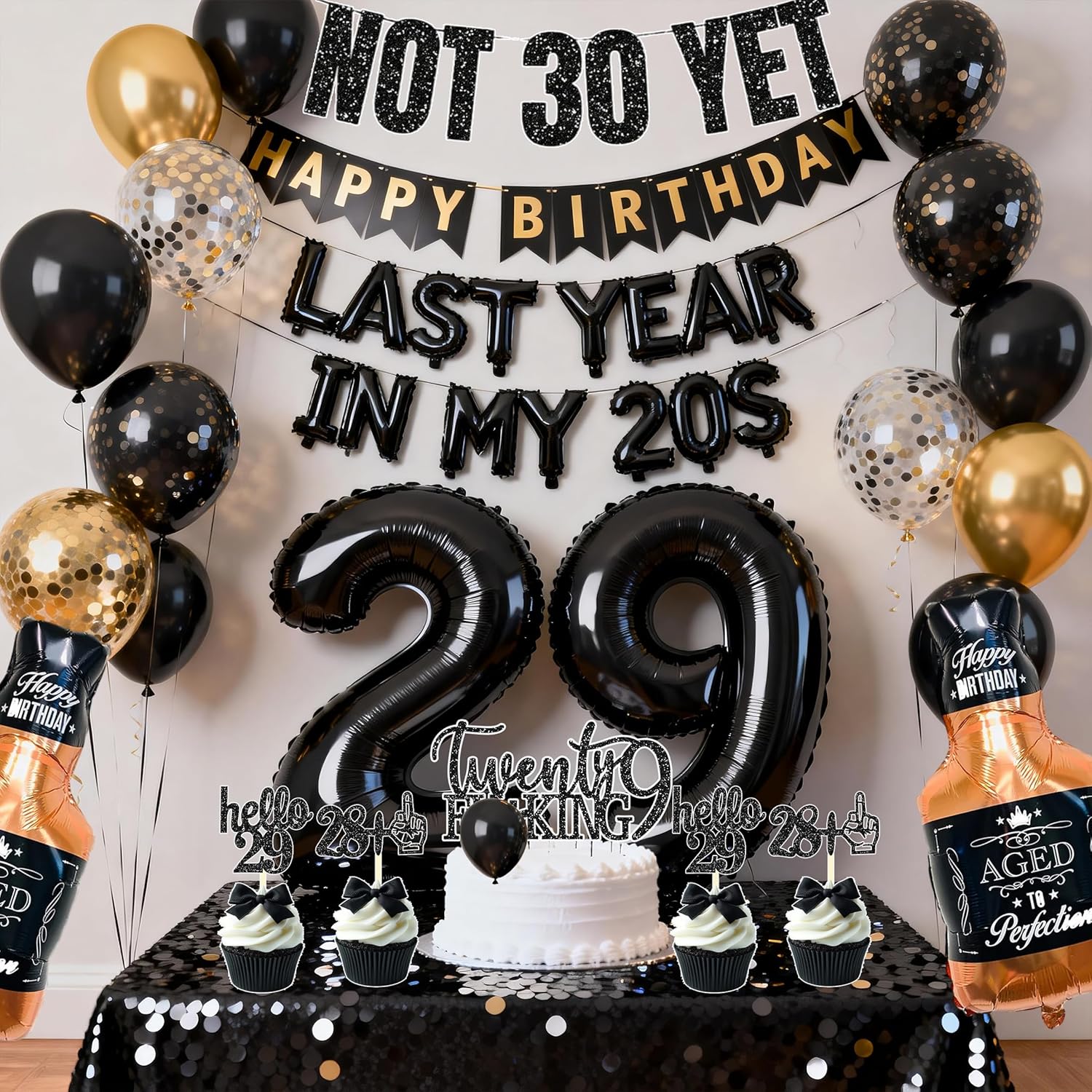 Last Year In my 20S Birthday Party Supplies for Men 29th Birthday Decorations include Balloon Banner Not 30 Yet Glitter Banner Cake Topper Cupcake Toppers Tablecloths(black and gold)
