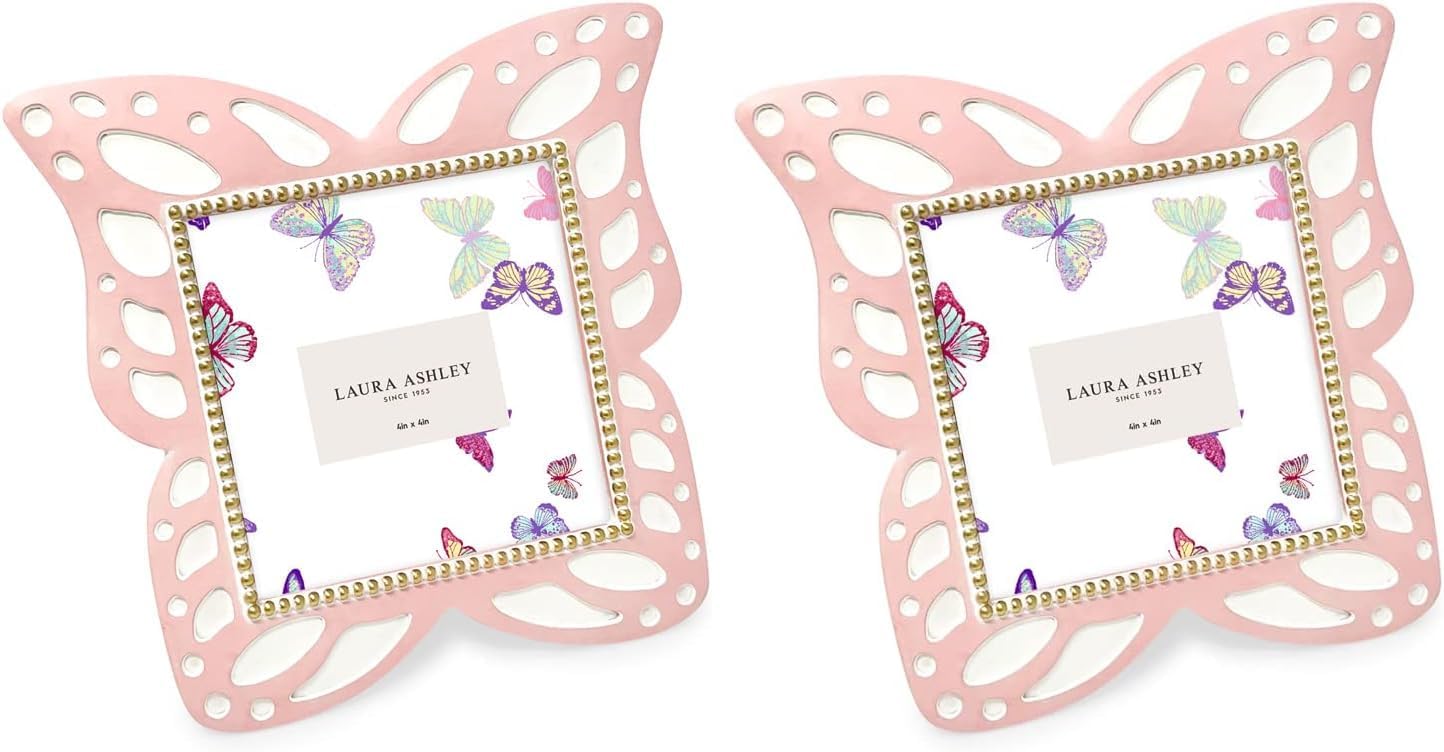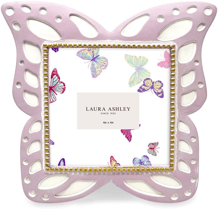 This Laura Ashley Resin Butterfly Picture Frame is a wonderful way to display your child’s curious nature throughout the home. Every day you wake up to see your baby smiling back at you in the crib is another day you will be taking photographs to capture all the new expressions and moves they will make. Whether you choose to place this frame on a desk, shelf, or cabinet, or hang it on a wall in the living room, its adorable design is sure to put a smile on the face of anyone who sees it. The frame gives off a rustic wood appearance and the detailed look of butterfly wings surrounding a dotted edge border, draws the eye to the photos you take. This novelty frame is sure to show off the adventures your growing child is getting into. Inside the butterfly wings, there are little circles that add depth and dimension to the frame. This resin frame has a special appeal that is sure to lift the mood of anyone who sees it. This frame has an attractive black, velvet back, with a matching easel and hook for wall-hanging. Switching out photos is as easy as flipping the turn buttons on the back and inserting a new photograph. This frame measures out as 6.5” x 6.75” and holds 4” x 4” photos. Whether you capture a first haircut or a fun day at the beach, this keepsake frame is a great choice to preserve all the memories parents cherish. This charming frame is an ideal gift for a baby-naming ceremony, or a birthday party. Your friends, family and loved ones will appreciate the gift of a simply adorable frame. This lovely butterfly frame is designed to celebrate all the little moments of cuteness you’ll capture as your kids’ personality takes flight around you. [NOTE: HOLDS 4” x 4” PHOTOS]