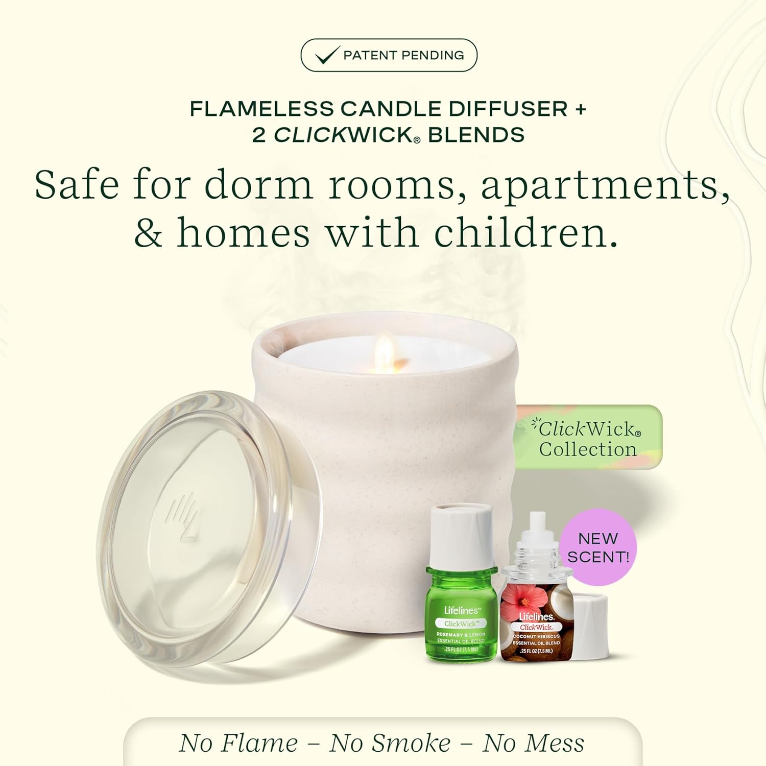 | Additional Features | Flameless, Safe, Aroma Diffuser, Blows Out, Flickering Flame, Innovative ClickWick bottle, Swap scents any time |