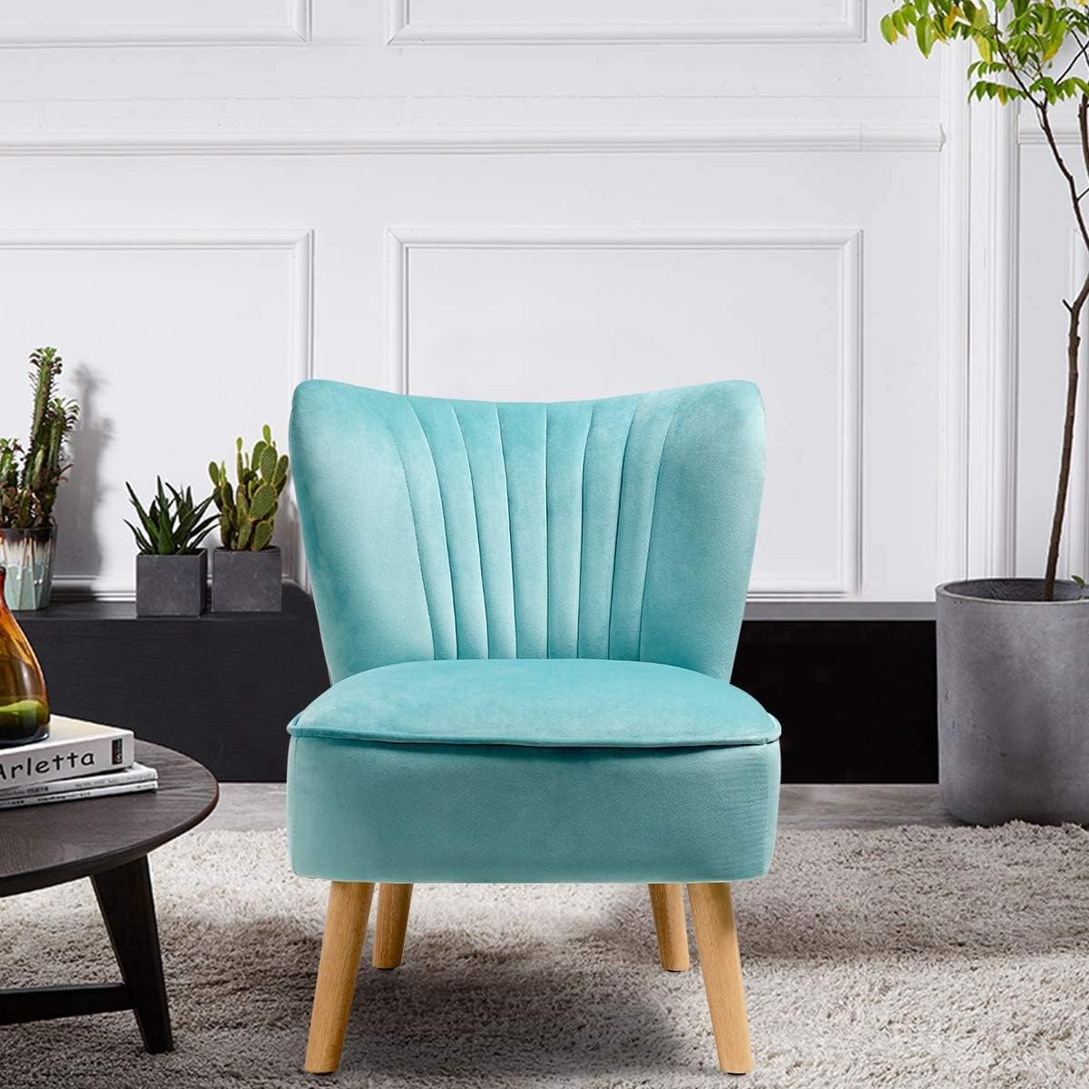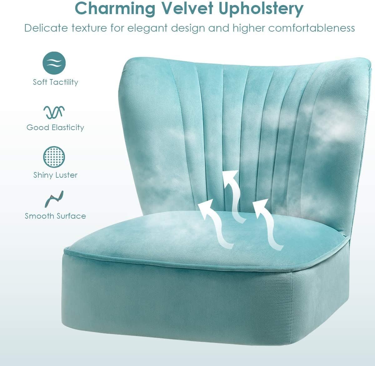 Description:Our modern style velvet accent chair provides a place to relax!The support legs of the accent chair are made of durable rubber wood to ensure good stability and weight-bearing capacity. In addition, the accent chair is equipped with a non-slip mat to avoid slipping and scratching the floor. The backrest and cushion are made of high-density foam padding and wrapped in velvet fabric, which is soft and skin-friendly with excellent elasticity. The ergonomic curved backrest of the accent chair provides support for the waist and back, and does not get tired after sitting for a long time. The modern style velvet accent chair is suitable for living room and bedroom, adding elegance and fashion. Besides, the accent chair with a compact design, will not take up too much space.Features:4 rubber wood support legs to ensure high load-bearing capacityEquipped with non-slip cushions to improve stability and avoid floor scratchesSoft and thick cushion to ensure the comfort of sittingErgonomic curved backrest provides lumbar and back supportCompact design for houses with less spaceModern style design suitable for bedroom, living room, etcDetailed user guide and complete parts for time-saving installationSpecifications:Color: Blue/ Pink/ TurquoiseMaterial: Rubber Wood, Sponge, Velvet FabricOverall Dimension: 21.5” x 19.5” x 30.5” (L x W x H)Seat Dimension: 19.5” x 19.5” (L x W)Weight Capacity: 250 lbsNet Weight: 17 lbs/ 34 lbsPackage Includes:1 x Velvet Accent Chair1 x User Guide
