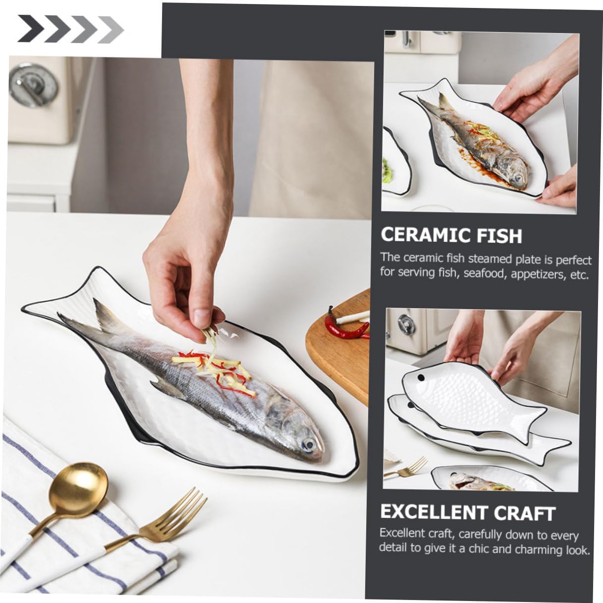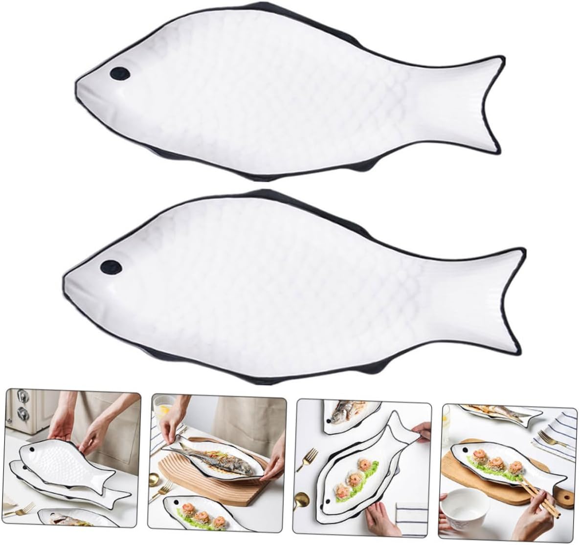Package Include 2 Steaming Plates Features -Product Info:Fish-shaped ceramic dish -Size(Large): 41.00X20.00X3.00cm/16.11X7.86X1.18in Creative Fish Holder -Color: White Fish Steaming Dish -Size(Medium): 35.50X17.50X3.00cm/13.97X6.89X1.18in Household -Material: Ceramic -Smooth surface without burrs, will not hurt or scratch your hands. The product has fine workmanship Kitchen Tableware. -The excellent workmanship of our product will bring you a Ceramic Fish-shaped Dish -The shape is delicate and lifelike, the color does not fade, the surface is smooth and polished Ceramic Fish Plate. -Environmental protection material, the product is safe and odor free to use in home, restaurant Fish-shaped Tray. -The product can be put in the microwave to the freshness and deliciousness of the fish Food Plate.Goods DescriptionAppetizer Serving Dish It is made of ceramics, strong and , and .Ceramic Fish Plate It has good high temperature resistance, and you can use it to make delicious steamed fish.Ceramic Plate Its craftsmanship is and delicate, and its appearance resembles a fish, which is deeply loved by people.Fish Steaming Tray Is your good choice for shopping.Home Steamed Fish This is a steaming plate with a fish-shaped appearance and practicality