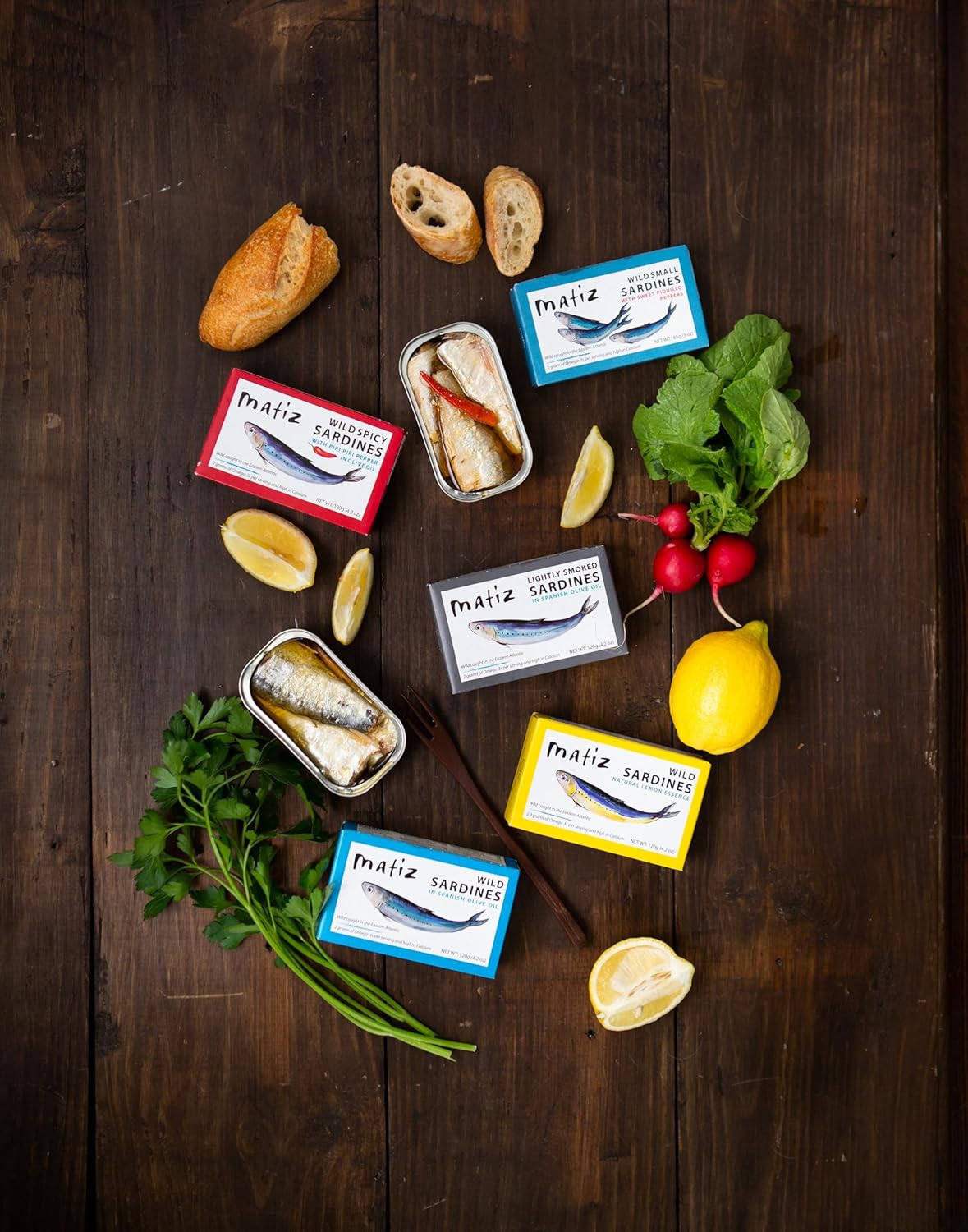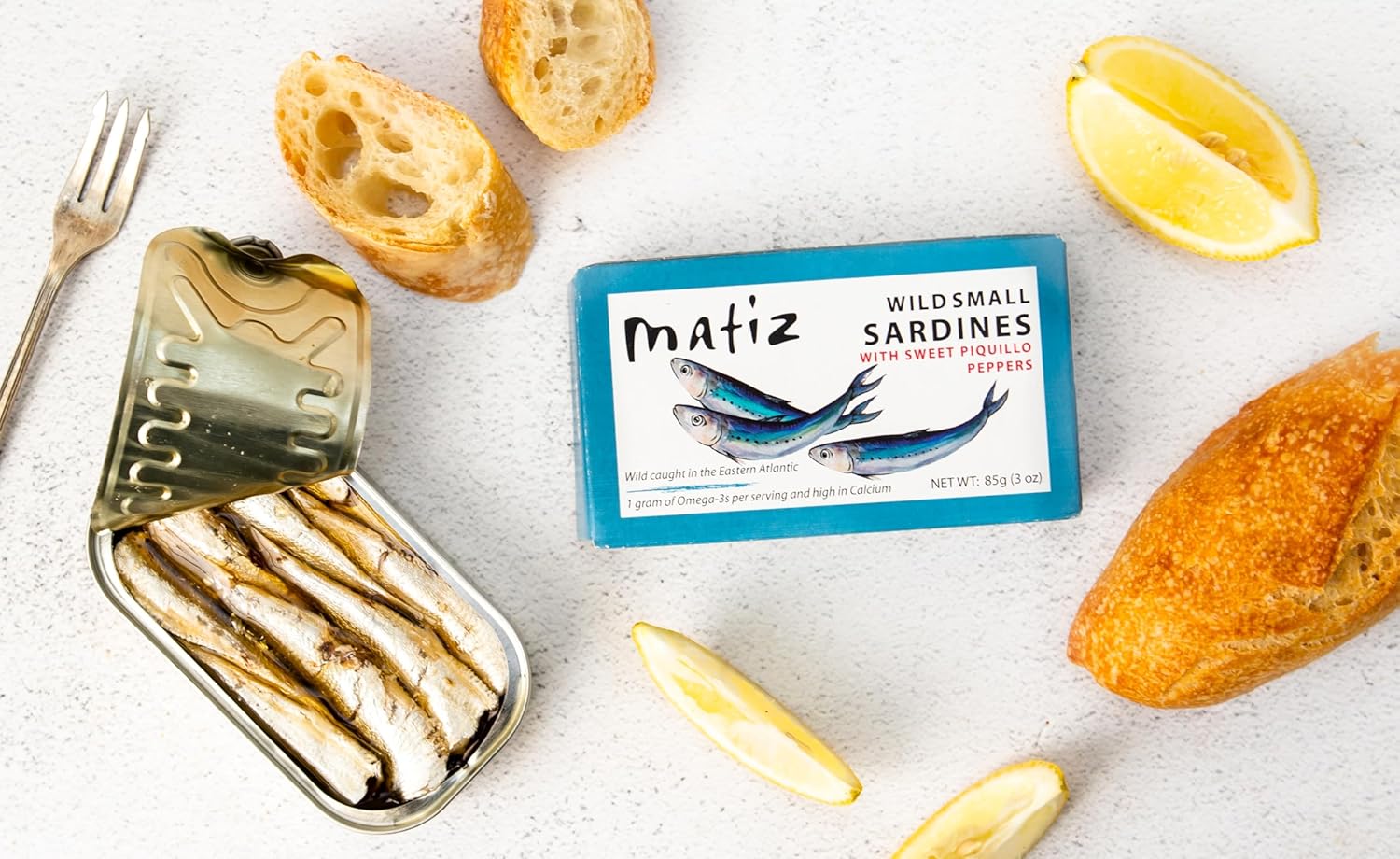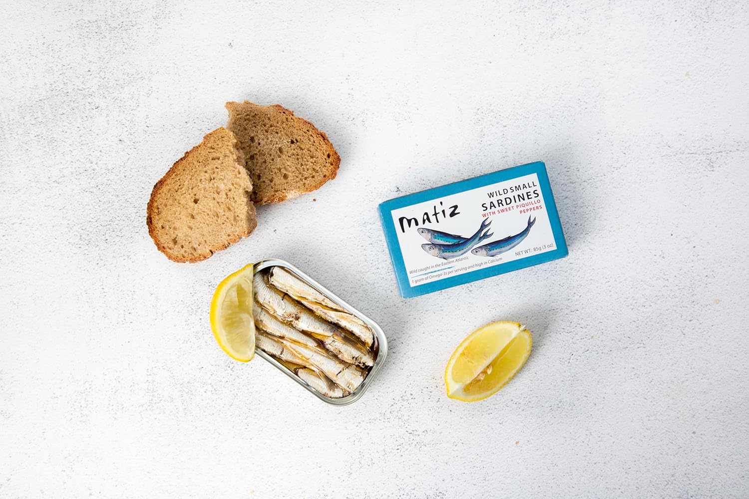 These-nutrient rich tiny sardines, or "Sardinillas" are harvested off the coast of Galicia are prized for their plump and tender texture and rich flavor. Their small size means their bones are far less noticeable compared to larger sardines, making them the perfect "starter" sardine! Packed in Spanish Olive Oil and a touch of sweet piquillo pepper, they make a tasty and satisfying snack straight out of the tin. Nutrients in a can with it's amazing omega 3s, protein, low in calories, high in calcium and potassium. Make Matiz sardines part of your healthy eating.
