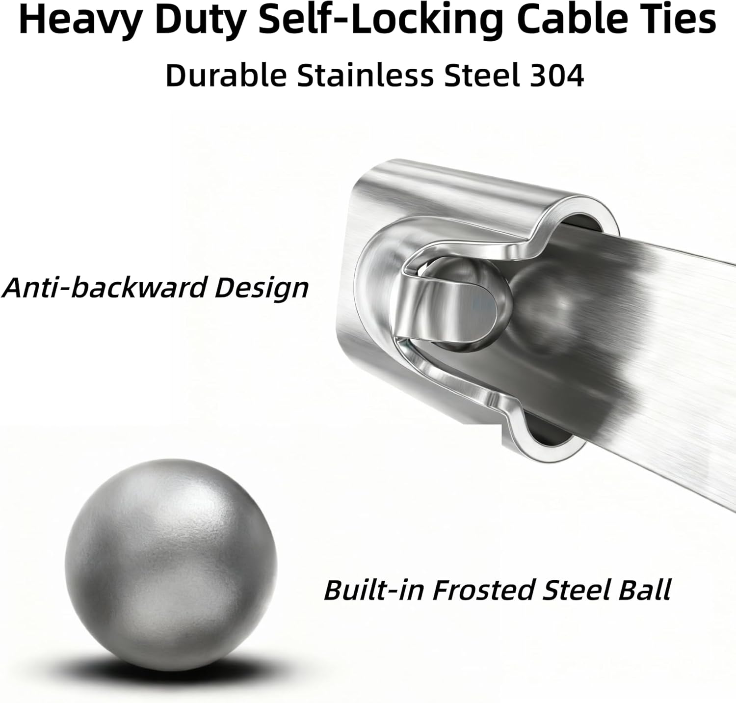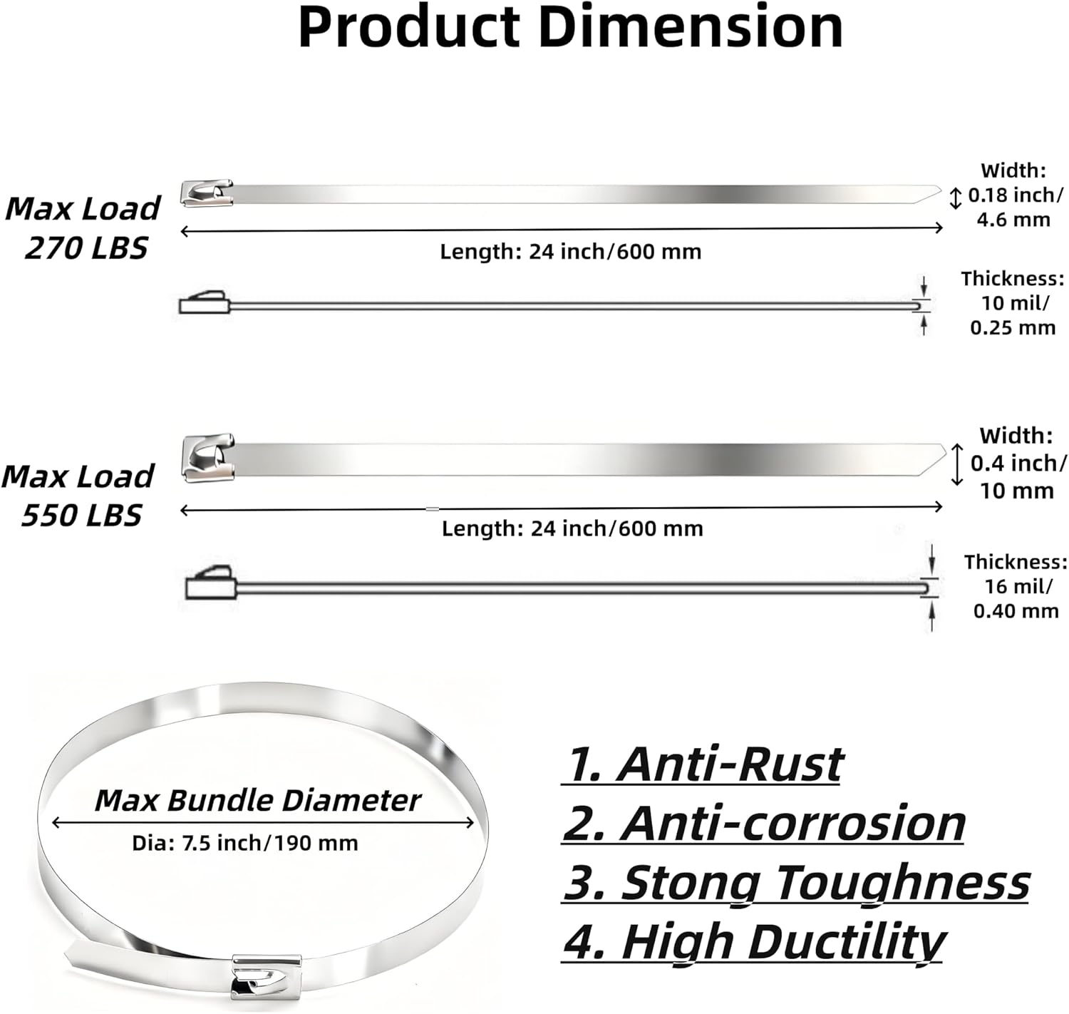 24 Inch Self-Locking Metal Cable Zip Ties, 50 Pcs 550 lbs Heavy Duty Stainless Steel Wire Ties 10mm wide and 0.4mm thick metal zip ties withstand a max tensile strength of 550 lbs, 8 times stronger than regular nylon zip ties Made of stainless steel, long service life and high tensile strength are the advantages of industrial ties With these stainless steel cable ties, you can tackle any outdoor projects without worrying the corrission issue They can be used in a wide range of industrial construction applications for pipeline link laying, steel frame fixing, temporary reinforcement, etc.