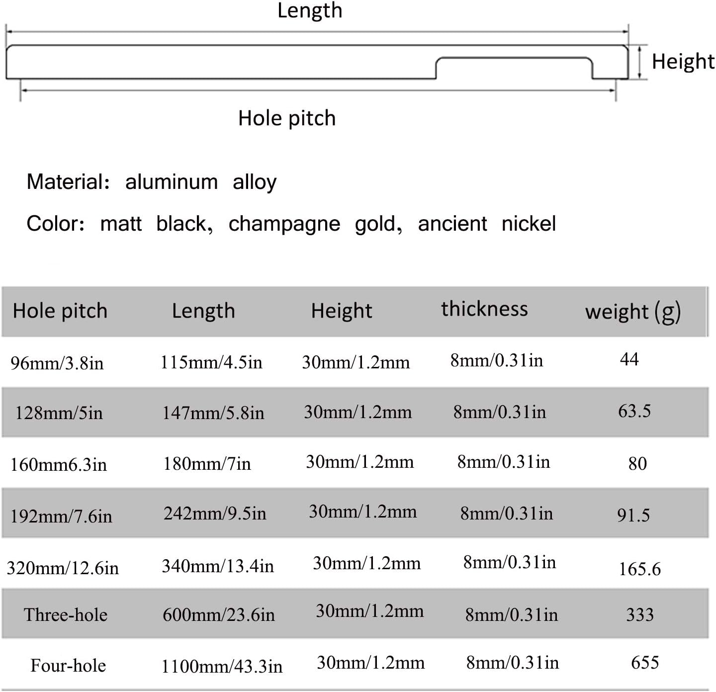 High-quality, durable and rust-proof aluminum alloy handles are the perfect complement to any kitchen, bathroom or cabinet.[About Products]Name: Furniture handleMaterial: aluminum alloyColor: matte black, champagne gold, ancient nickelHole distance: 96mm, 128mm, 160, mm, 192mm, 320mm, length 600mm (three-hole installation), length 1100mm (four-hole installation)Height: 30mmThickness: 8mm[Package Contents]1 x handle2 x screws (standard screw length is 22mm, suitable door thickness is 18mm. If you need other screw lengths, please contact us first!)characteristic:*Made of high-quality materials, comfortable hand feel, long service life, easy to install*Exquisite, classic and creative design, decorate your furniture with this new handle.*Widely used in various furniture hardware such as cabinets, drawers, storage cabinets, etc., can be used with various fasteners such as furniture doors or suitcases[note]*Due to manual measurement, each handle may be slightly different, and the measurement error is 1-2mm. Before buying, please carefully measure the center and length of the hole in the cabinet or other furniture.*If you need other lengths, please contact us. We can provide screws with lengths of 25 mm, 30 mm, 35 mm and 40 mm.*welcome to our shop! If you have any questions, please feel free to contact us via email so that we can provide you with the best service.