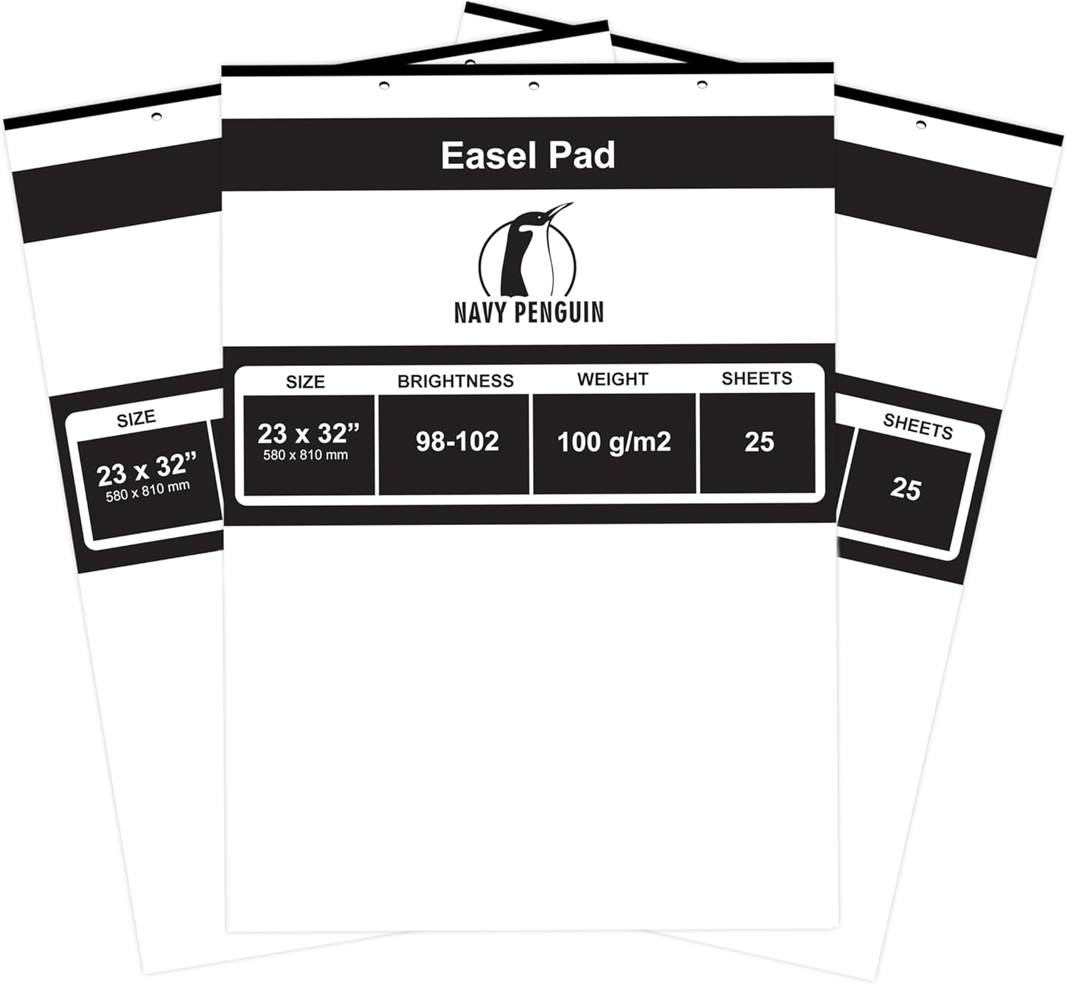 Easel Paper Pad - 3 Pack (75 sheets in total) ✔ Premium 3 pack - 25 sheets in each pack, 75 sheets in total. ✔ Multifunctionality - perfect for adult organization planning, presentation, to do lists and messages. ✔ Top quality material - 3-hole punched, 100 gsm plain white paper, 98-102 brightness. Could be easily hung on the whiteboard easel or just on the wall using the nails. ✔ Perfect Size - exact size of the easel pad is 23 x 32". Fits all traditional easel boards and flipcharts. Navy Penguin - Lifetime Guarantee If you for any reason are not happy with any product by The Navy Penguin, please do not hesitate to contact us and we will do our best to solve your problem asap! At The Navy Penguin we take full ownership and responsibility for the quality of our products.