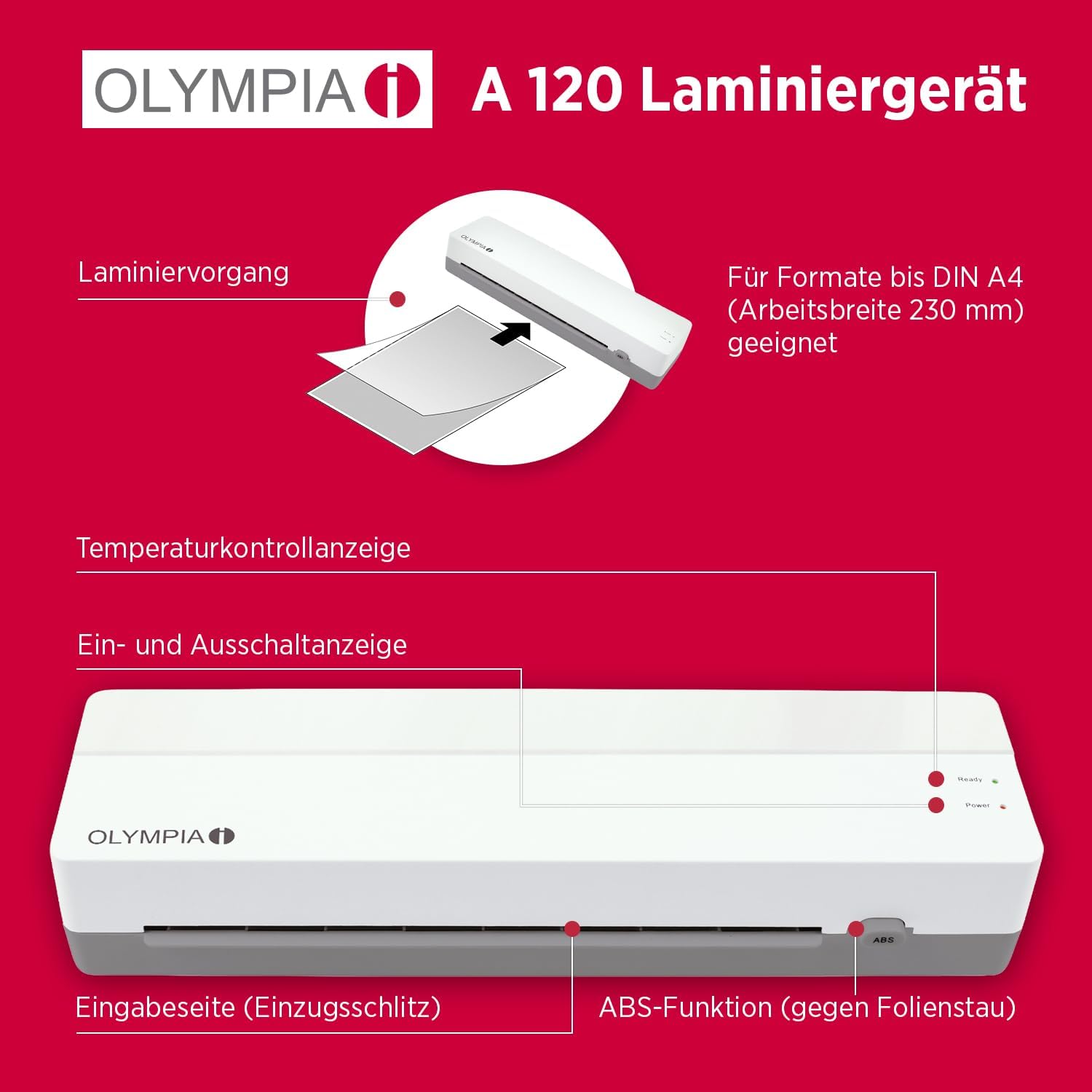 The OLYMPIA A 120 laminator A4 is a compact laminator for use in the office, school or at home. It laminates formats up to DIN A4 with a working width of 230 mm and supports film thicknesses from 80 to 125 micron. The device is designed for hot laminating and requires a warm-up time of about 3-5 minutes. Laminating speed is around 300mm per minute. Two LED lights inform about the operating status. The equipment includes an ABS function that makes it easy to remove film jams. The compact design makes it easy to store and transport. The package includes 5 A4 80 micron laminating pouches so you can use it immediately.