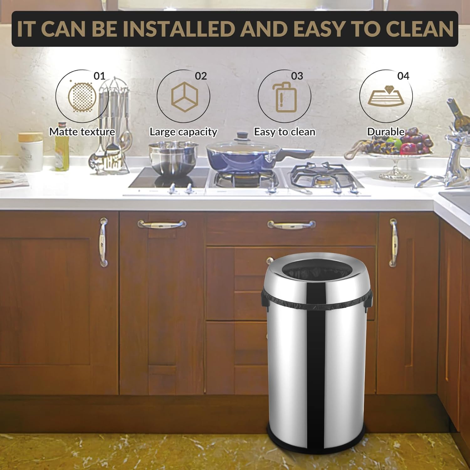Keep your space tidy and stylish with this large 17-gallon open top trash can, perfect for any kitchen, bathroom, or office. Crafted from stainless steel, this modern garbage can combines functionality with an elegant design, making it an ideal choice for both home and commercial use.Highlights at a glance:17-gallon capacity meets all your waste disposal needs in high-traffic areas.Open top design allows for quick and convenient waste disposal without lifting a lid.10.2-inch wide open top accommodates larger items and minimizing spills.Thick, heavy-duty stainless steel ensures durability and longevity.Non-slip TPR rubber bottom prevents sliding or tipping during use.Side handles for easy transport.A lift-out lid for hassle-free trash bag changes.Specification:Size: 15.7x15.7x27 inchesColor: silverMaterial: stainless steelFriendly note:For best results, use trash bags that fit snugly within the compartments to avoid spills and ensure cleanliness.Regularly clean the stainless steel surface with a soft cloth to maintain its sleek appearance.Avoid overfilling the trash can.Packing list:Open top trash can x1