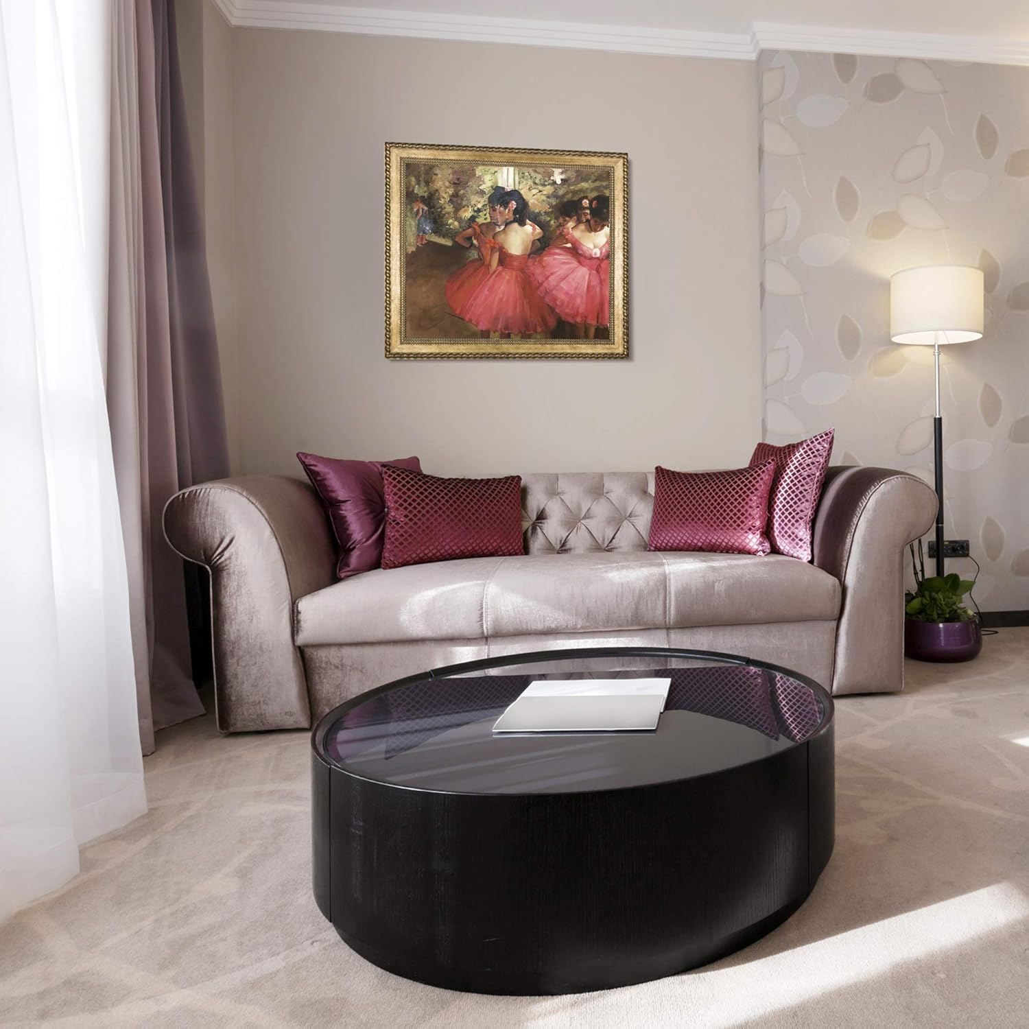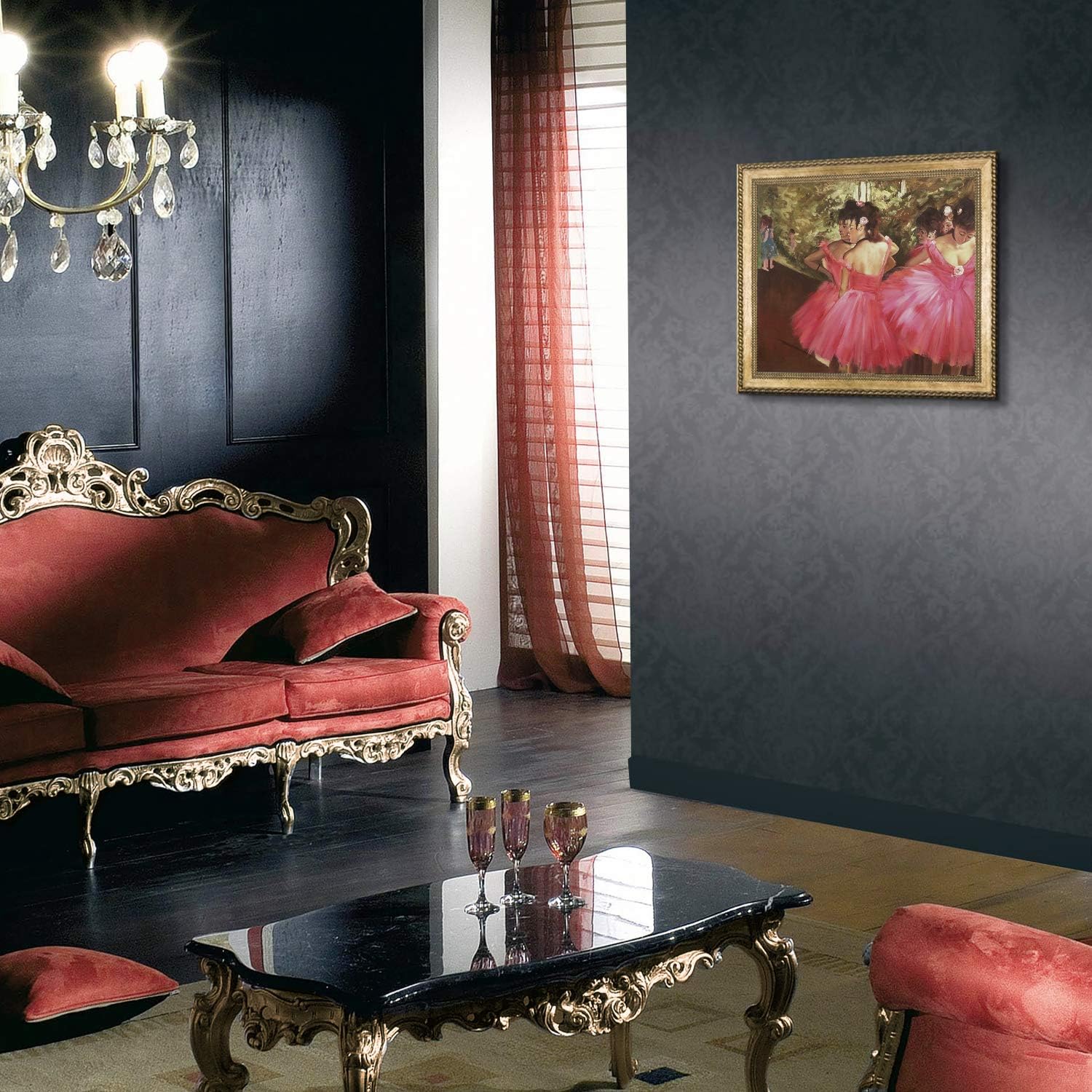 Product Description Degas' Dancers in Pink is yet another behind-the-scenes depiction at the ballet. According to some estimates, Degas' entire body of work includes some 1500 paintings, drawings and sketches on the subject of dance. True to form, the subjects in this painting do not address the viewer directly, but rather look inward, which is quite common in Degas paintings. They also seem to share a certain intimacy derived from performing and rehearsing together. Another common theme is clusters of figures. Degas has included that here, too, as the dancers gather on the right-hand side of the canvas. The pink costumes are delicately depicted with sweeping motions. And, again, there is great contrast between the level of detail on the dancers themselves and the blurry background behind them where other dancers gather. Frame Description: Verona Gold Braid Frame From the Manufacturer OverstockArt is an art manufacturer of framed hand painted oil reproductions and canvas art prints. overstockArt was among the earliest online galleries of hand painted oil paintings and the first to focus on art reproductions of great masters such as Van Gogh, Monet and Klimt. From Impressionist art to Modern Art, overstockArt has the perfect framed canvas art for your home. At overstockArt, we live and breathe the oil paintings that surround us and feel we have a special connection with our customers. Put simply, we are art lovers serving art lovers.