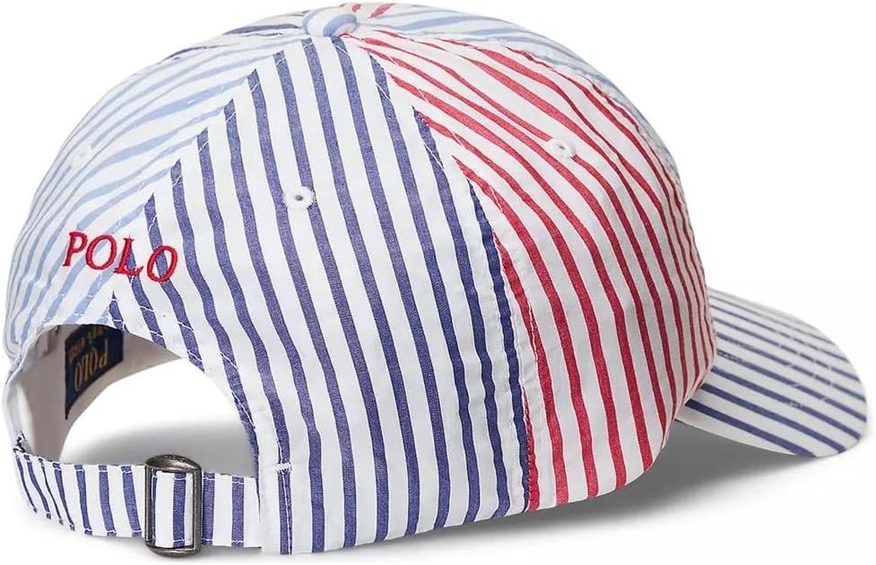 The classic ball cap is updated in color-blocked panels of striped cotton oxford and Ralph Lauren's signature embroidered Pony.