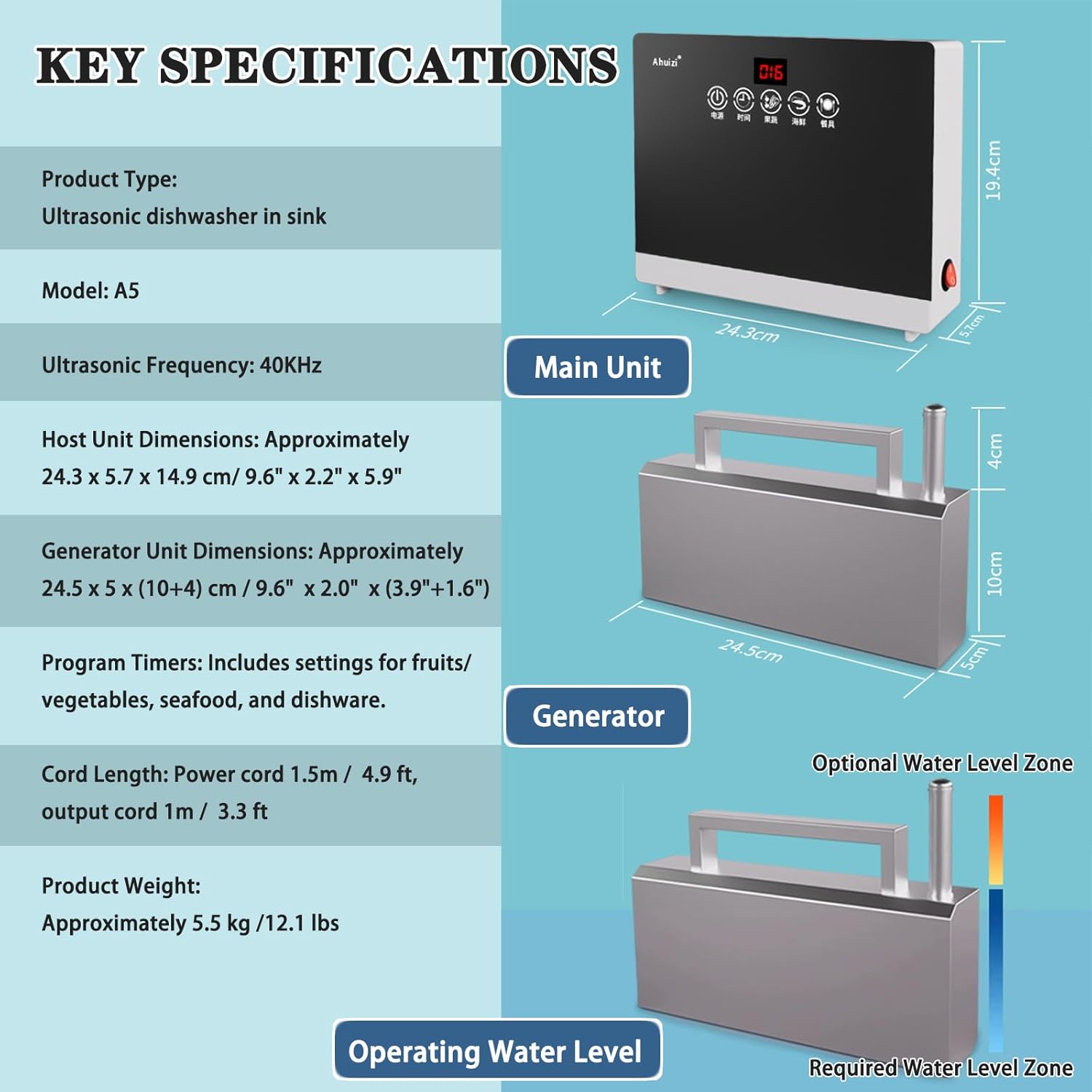 This ultrasonic sink dishwasher is a portable electric dishwasher in sink designed for cleaning tasks. It operates using ultrasonic technology, intended for washing items such as dishware, fruits, and vegetables directly within the sink basin.Key SpecificationsProduct Type: Ultrasonic dishwasher in sinkModel: A5Ultrasonic Frequency: 40KHzHost Unit Dimensions: Approximately 24.3 x 5.7 x 14.9 cm/ 9.6" x 2.2" x 5.9" Generator Unit Dimensions: Approximately 24.5 x 5 x (10+4) cm / 9.6" x 2.0" x (3.9"+1.6") Program Timers: Includes settings for fruits/vegetables, seafood, and dishware.Cord Length: Power cord 1.5m / 4.9 ft, output cord 1m / 3.3 ftProduct Weight: Approximately 5.5 kg /12.1 lbsWhat's IncludedYour purchase includes one automatic dishwasher in sink unit.General NotesColor Representation: Product images aim to show actual appearance. Variations in monitor displays and lighting may cause slight perceived differences.Size Measurement: All dimensions are approximate and based on manual measurement.Support: For any questions regarding this electric sink dish washing machine cleaner or its use, you are welcome to contact our support team.Intended UseThis sink dishwasher serves as a cleaning appliance for the sink area. It is presented as an option for those seeking a ultrasonic dishwasher for various kitchen washing needs.