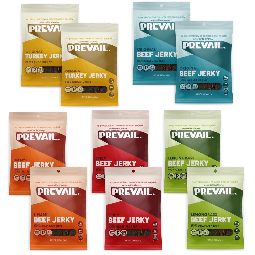 PREVAIL. 100% Grass Fed Beef Jerky & Free Range Turkey Jerky Variety Pack Gift Box, - Low Sodium and Gluten Free! | Original, Umami, Spicy, Lemongrass Beef Jerky & Original Turkey Jerky - Box of (10) Bags - 2 of each | Our Gourmet Jerky is High Protein, Low Calorie, Paleo Certified, Soy Free, and Top 8 Allergen Free!