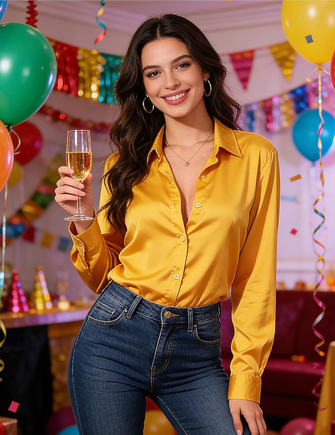 | Model Name | Women's Mardi Gras Satin Silk Blouse 80s Disco Party Button Down Long Sleeve Work Shirt Casual Top |