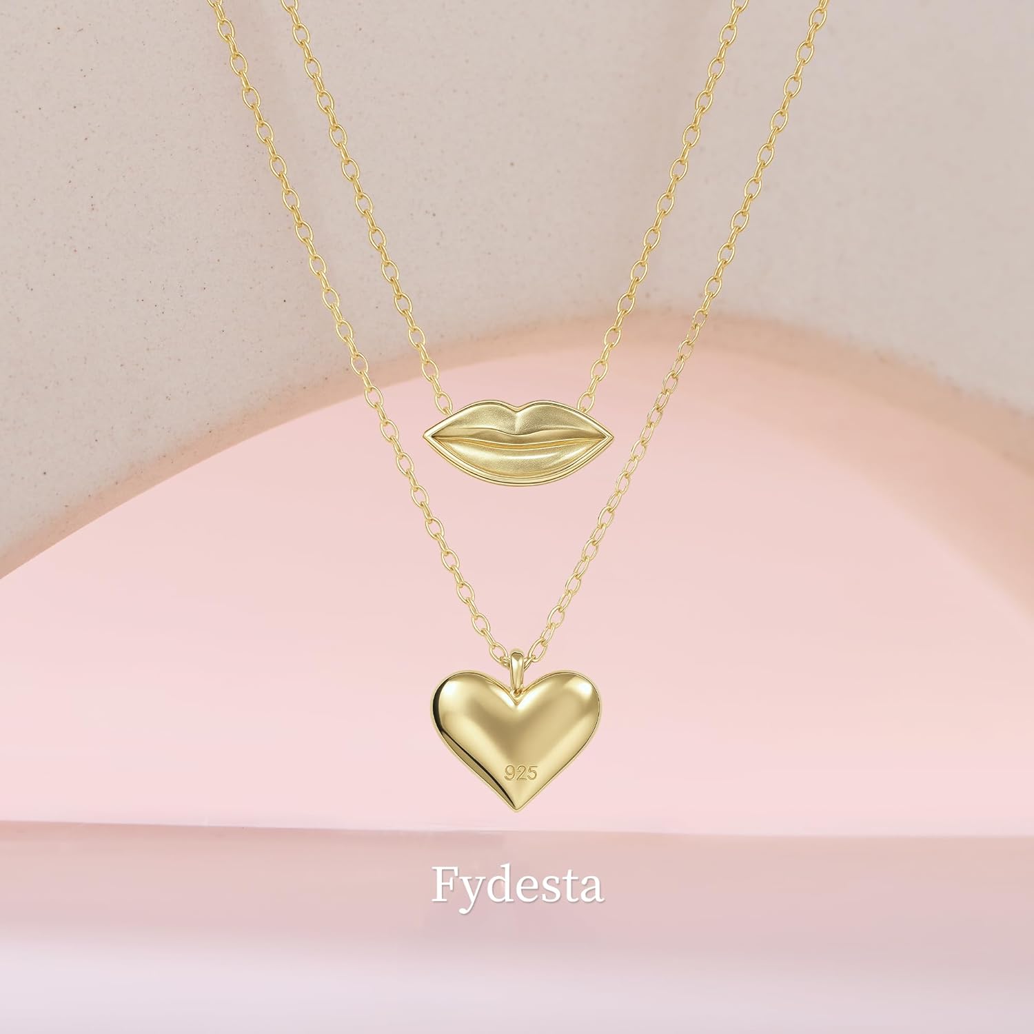 S925 Sterling Silver Layered Necklace for Women, Double Chain Red Lip and Heart Pendant Jewelry