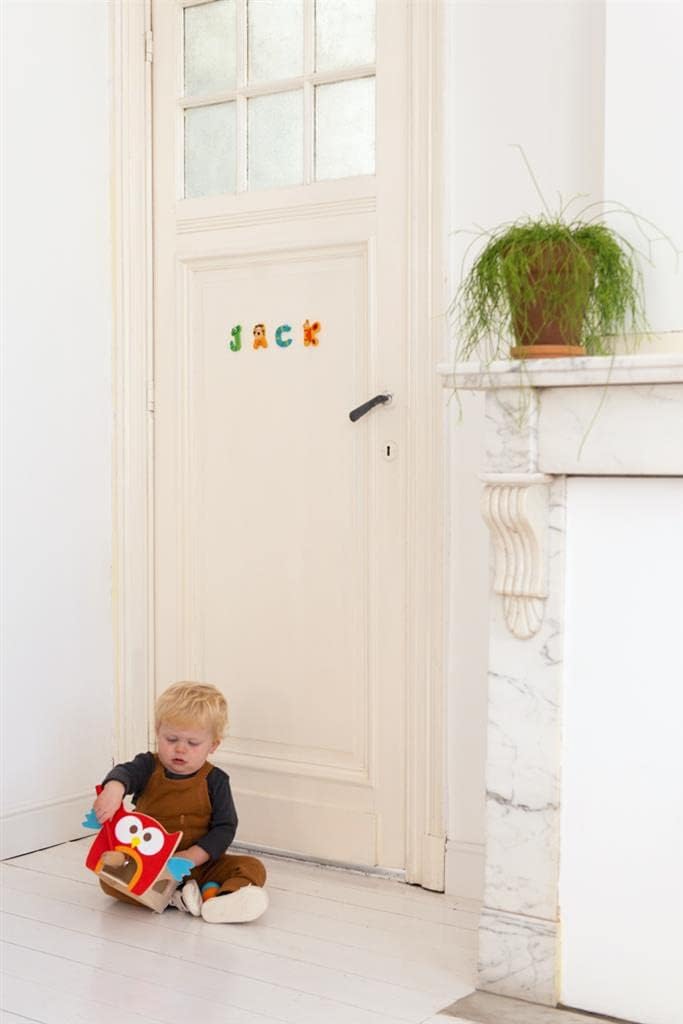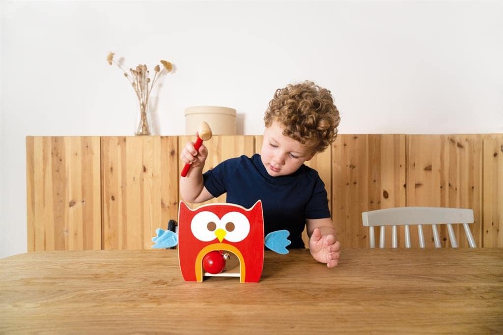 “Toc toc”! Knock the coloured balls with the hammer and listen to the little bell ring!This colourful owl helps children to react faster while having lots of fun! Put the 4 brightly coloured balls on the right opening. Now knock the balls through the holes with the little wooden hammer and fun galore!This game helps children to grow familiar with different colours.Made out of wood with wings of felt. *after playings: slide the hammer through the hole to keep the balls securely insideContent4 colored balls, a hammer and a bell, in box