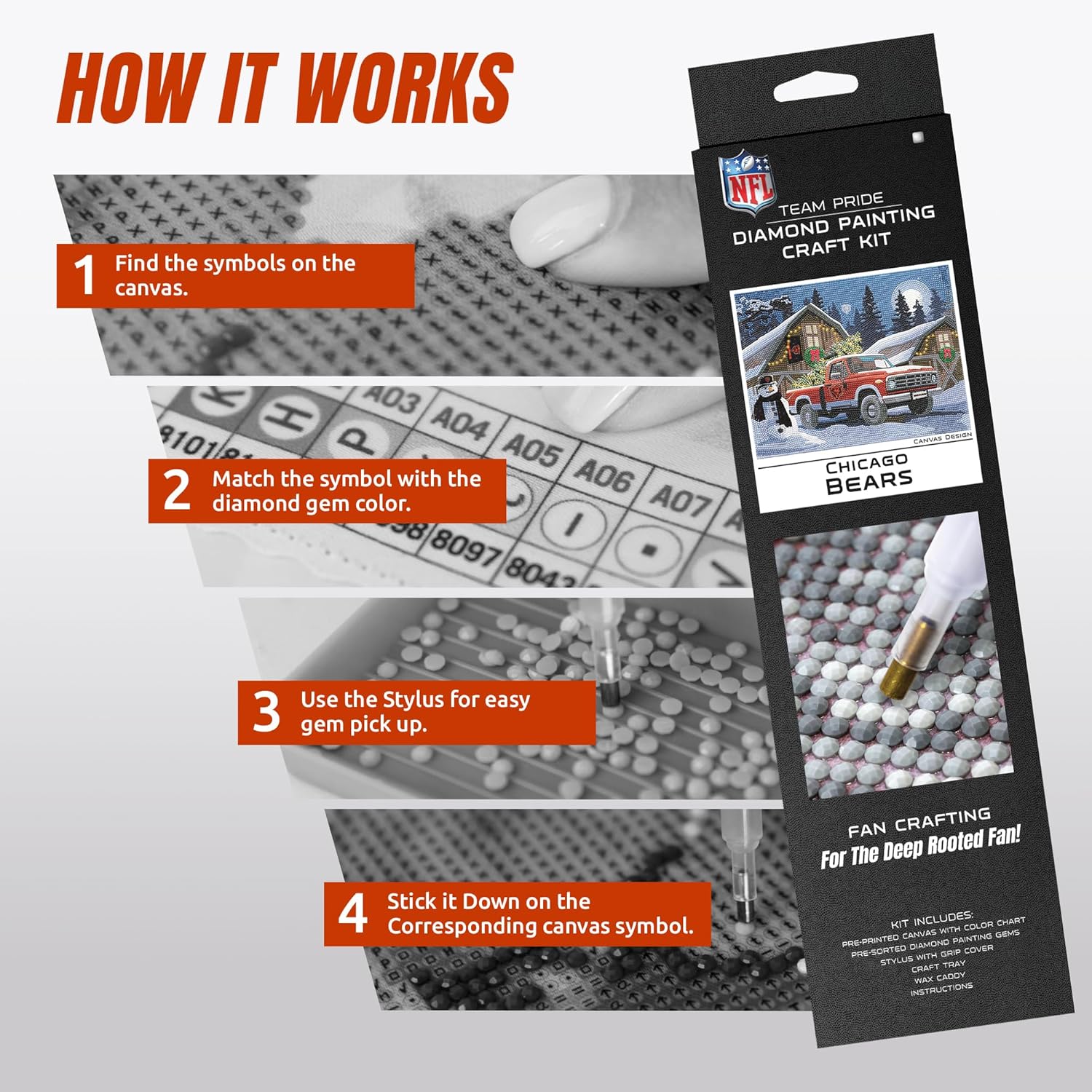 Unleash your inner artist and show off your team pride with the NFL Winter Farm Truck Chicago Bears Diamond Painting Craft Kit. This officially licensed DIY craft kit includes everything you need to create a stunning fan art piece. Whether you're a beginner or an experienced crafter, this kit is perfect for all skill levels. The high-quality color-printed fabric serves as the canvas for your masterpiece, while the pre-sorted diamond gems make crafting easy and fun. The kit includes a stylus with a comfort grip, a wax caddy, a craft tray to hold your gems, and easy-to-follow instructions that walk you through the entire process. Once completed, frame your custom art and proudly display it in your fan cave, college dorm, home, or office. The detailed design offers a great way to show support for your favorite team while engaging in a fun and creative activity. Caring for your project is simple. If the fabric gets soiled, you can gently wipe it with a soft cloth dampened in cold water. After finishing, use a rolling pin over the protective film to secure the gems in place, ensuring they adhere strongly to the sticky fabric. To store your design, gently roll it with the image side facing inward to avoid damaging the gems. This kit is recommended for ages 13 and up, and it’s important to keep it away from ink pens, paints, and avoid washing, ironing, or dry cleaning the fabric. Create the ultimate piece of fan art with this complete and easy-to-use diamond painting craft kit!