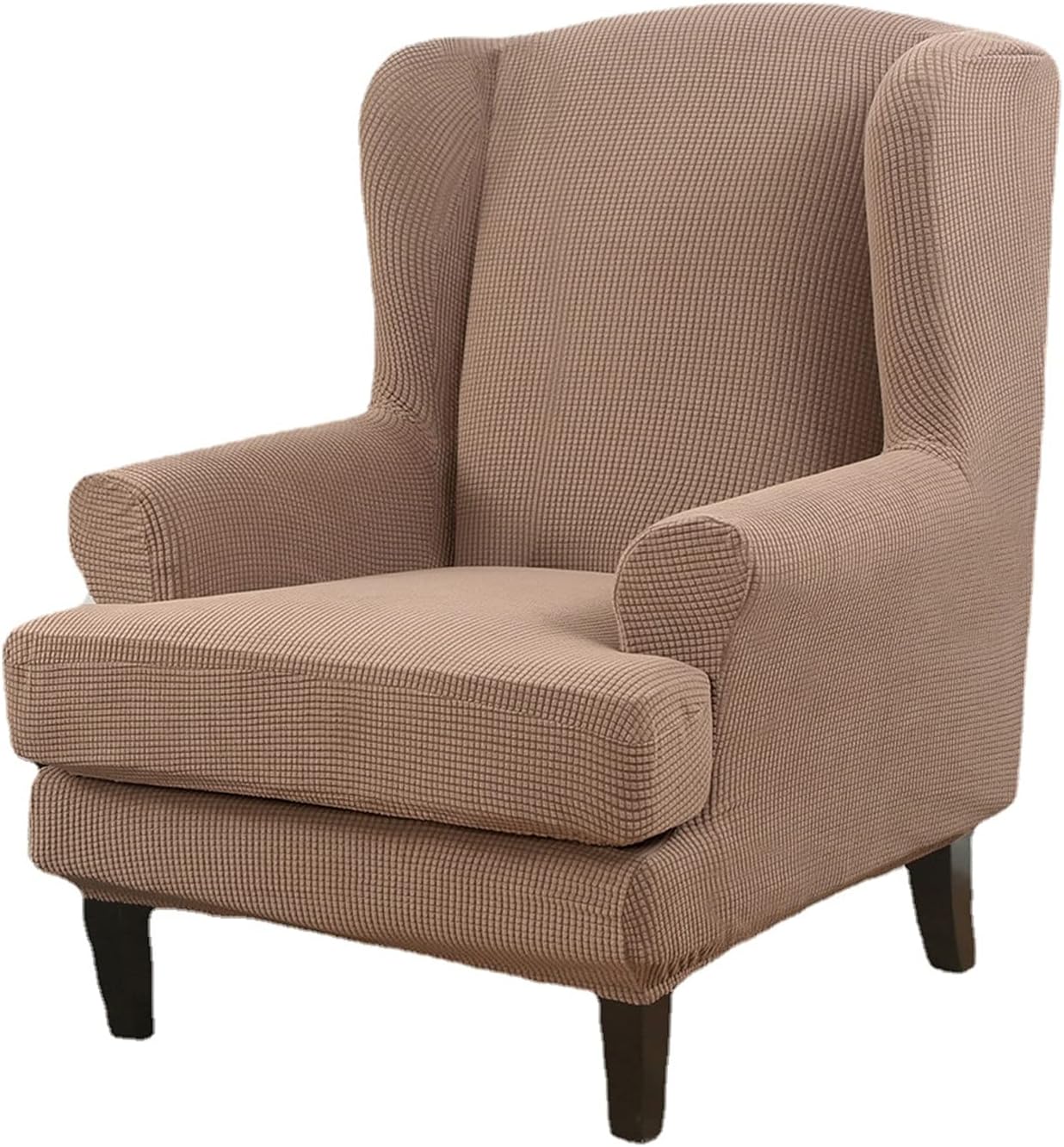 This wing chair cover will give your sofa a new look and is suitable for both leather and fabric furniture. It will beautify your sofa and extend its life. Features of the wing chair cover:The armchair cover consists of two parts, one is the base wing chair cover and the other is the cushion cover. It can cover the wing chair perfectly.The base of the cover and cushion cover have elastic stitched to the bottom for a perfect fit on your chair and the high elasticity allows for a better adaptation to the size and shape of the sofa.Easy to put on and take off, simply place the excess fabric in the gap between the back and the seat for the perfect look.The wing chair cover protects your armchair from food and drink spills, pet hair and mess, and the cover is easily machine washable.Our stretchy wing chair covers make great birthday gift ideas for holiday or birthday gifts for mum, dad, friends. Suitable size:Wing chair length: 70-80cm (27.5-31.5in)Wing chair width: 80-92cm (31.5-36.2in)Wing chair height: 95-110cm (37.4-43.3in) Package includes:1x wing chair cover1x cushion cover note:2-piece set includes wing chair cover and cushion cover only, wing chair and cushion are not included.Suitable for most standard winged chairs and sofas with slits. Can be padded with extra fabric.If your wing chair does not have any gaps to fill with extra fabric, it may not be perfect.All images are taken in real life, but there may still be a slight colour variation due to the monitor or lighting.