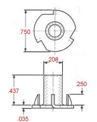 T-NUT 8-32 X 7/16" LENGTH, 4 PRONG, ZINC PLATED STEEL, PRESS-IN THREADED INSERT FOR WOOD OR PLASTIC. (PACK OF 100)