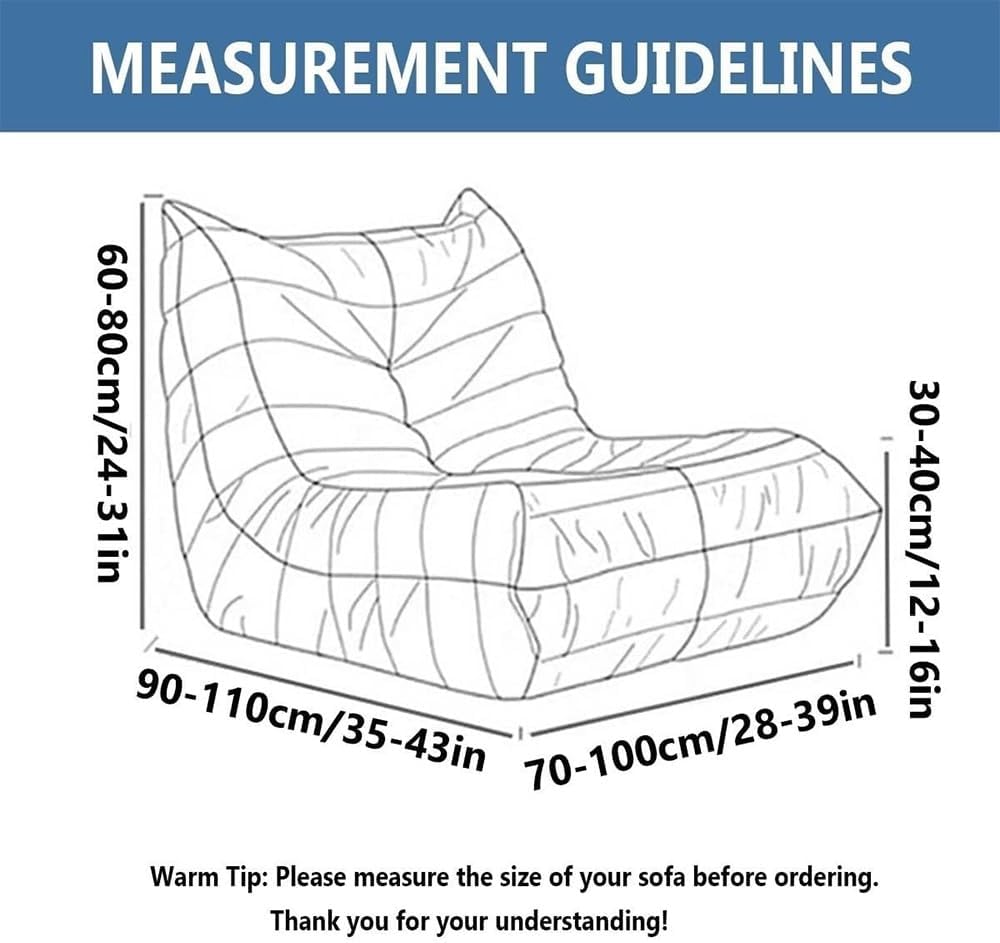 Functions:1.The elastic fabric stretches more easily and fits snugly for your fireside chair/lazy floor sofa /bean bag chair/ armless lounge chaise.2.Not only protect your furniture from daily wear, tear, and stains. But also make your old furniture appear brand new.3.Ideal for homes with children and pets or anyone seeking the best solution for furniture protection.Package Includes:1 × Sofa CoverNote:1.The size is measured by hand, please allow a slight deviation within 2cm;2.Due to differences in shooting lighting and screen resolution, there may be slight color differences between images and objects. Please rely mainly on the received object.