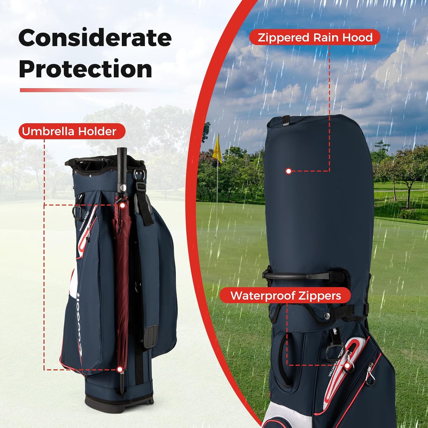 Product description DescriptionDiscover a new level of organization and convenience on the golf course with our golf cart bag. This golf bag features a 14-way divider top that helps keep your clubs neatly arranged and protected. Large storage capacity is provided by 6 zippered pockets, including a cooler pocket, 2 soft-lined pockets for valuables, a front small pocket for balls or tees and 2 full-length side pockets for apparels. The zippered rain hood protects your clubs from sun and rain, while the umbrella holder ensures you're prepared for changes in weather conditions. Besides, this lightweight golf cart bag comes with an adjustable padded shoulder strap and lifting handle, making it comfortable to carry.Feature14-way top dividers to organize and protect your clubs 6 zippered pockets provide plenty of storage space The cooler pocket keeps beverages chilled on the course2 soft lined pockets for storing your phone, wallet and keys Lightweight design to easily carry the golf bag anywhere Adjustable shoulder strap with soft foam padding reduces pressure Built-in handles ensure convenient carrying when needed Removable rain hood to protect clubs in any weatherIncludes a glove holder, towel ring and umbrella holder Stable base keeps the bag upright on various groundsSpecificationColor: Grey /NavyMaterial: Polyester FabricBag Height (with Rain Hood): 50" Bag Height (without Rain Hood): 33.5" Top Dimensions: 12.5" x 10" (L x W)Base Dimensions: 10" x 9" (L x W)Net Weight: 4.7 lbsPackage Includes:1 x Golf Cart Bag1 x Rain Hood Manufacturer Contact Information /