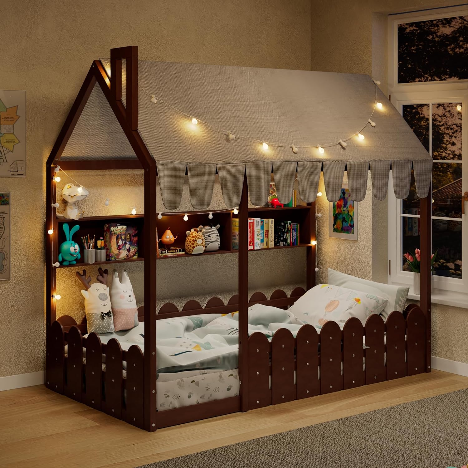 Create a playful and functional sleep space with this versatile house bed for kids, designed to inspire imagination while supporting everyday comfort. Available as a twin house bed, this charming house floor bed features a customizable chimney that can be installed on either side to fit your room layout. The cozy tent canopy and built-in 3-mode lights add a warm, inviting glow, making this montessori house bed perfect for both bedtime and playtime. Designed as a low-profile kids montessori bed, it allows easy in-and-out access, encouraging independence and confidence. The sturdy wood structure and surrounding rails create a secure twin floor bed with high rails, offering added peace of mind while maintaining airflow and visibility. Three built-in shelves provide convenient storage for books and toys, helping keep the space organized. Ideal as a bed frame for kids or one of the best floor beds for kids, this house bed twin combines safety, style, and functionality for any child’s bedroom. Weight & Dimensions Overall Product Dimension: 77.8"L x41.3"W x67.1"H Number of Package: 1 Overall Product Weight: 83.51 LBS Recommended Mattress Thickness: 6"-8" Specifications Product Type: House Bed Size: Twin Color: Espresso/White/Gray Material: Plywood, MDF, Pinewood Box Spring Required: Yes Number of Slats: Slats are not included Assembly Required: Yes Country of Origin: Vietnam Notes: Manual measurement has been used,there may be some reasonable error.All the pictures are taken by actual samples, slight chromatic aberration may occur due to lighting or display.